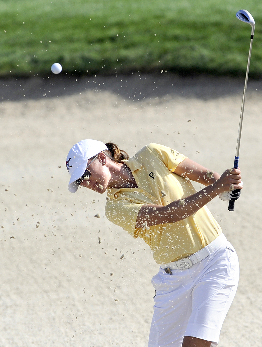 The fifth green is the second-smallest on the course and is surrounded by bunkers — including a pair of deep sand traps left of the green.