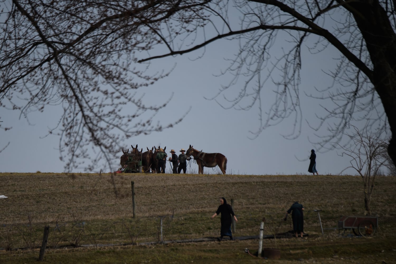 Men hold onto a team of work horses at a farm on Thursday, March 14, 2019, in Strasburg Township, Lancaster County. The Plain People limit formal education and typically live in rural areas, farming or working in trades.