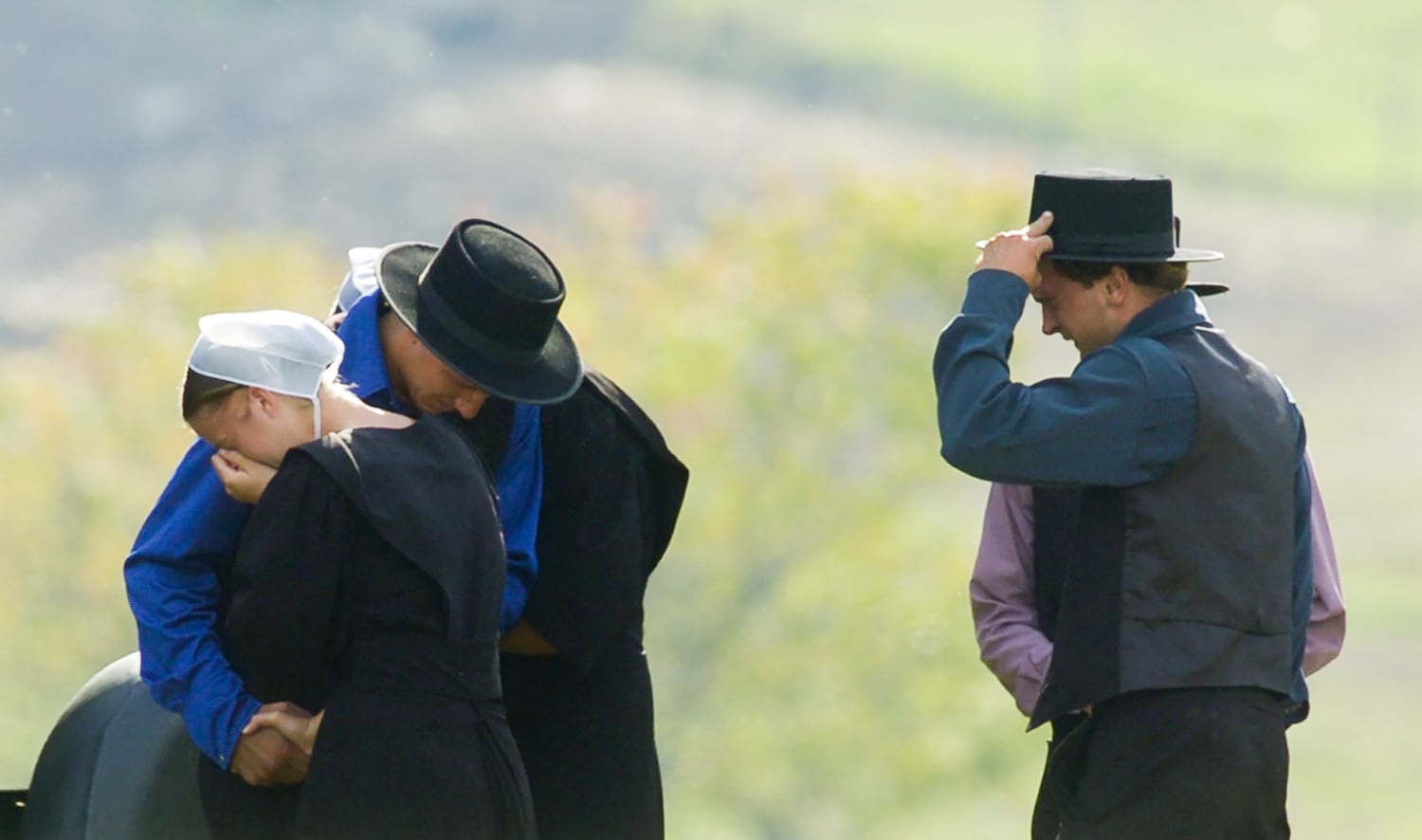 People gather near a viewing for one of the victims of the West Nickel Mines Amish School shootings, Tuesday, Oct. 3 2006, in Bart Township. A man shot 10 schoolgirls in the one-room schoolhouse before killing himself. Five girls died. People worldwide sent millions of dollars to the Nickel Mines Amish settlement, who in turn gave a portion to local emergency services and to the family of the shooter. (Andy Starnes/Post-Gazette)