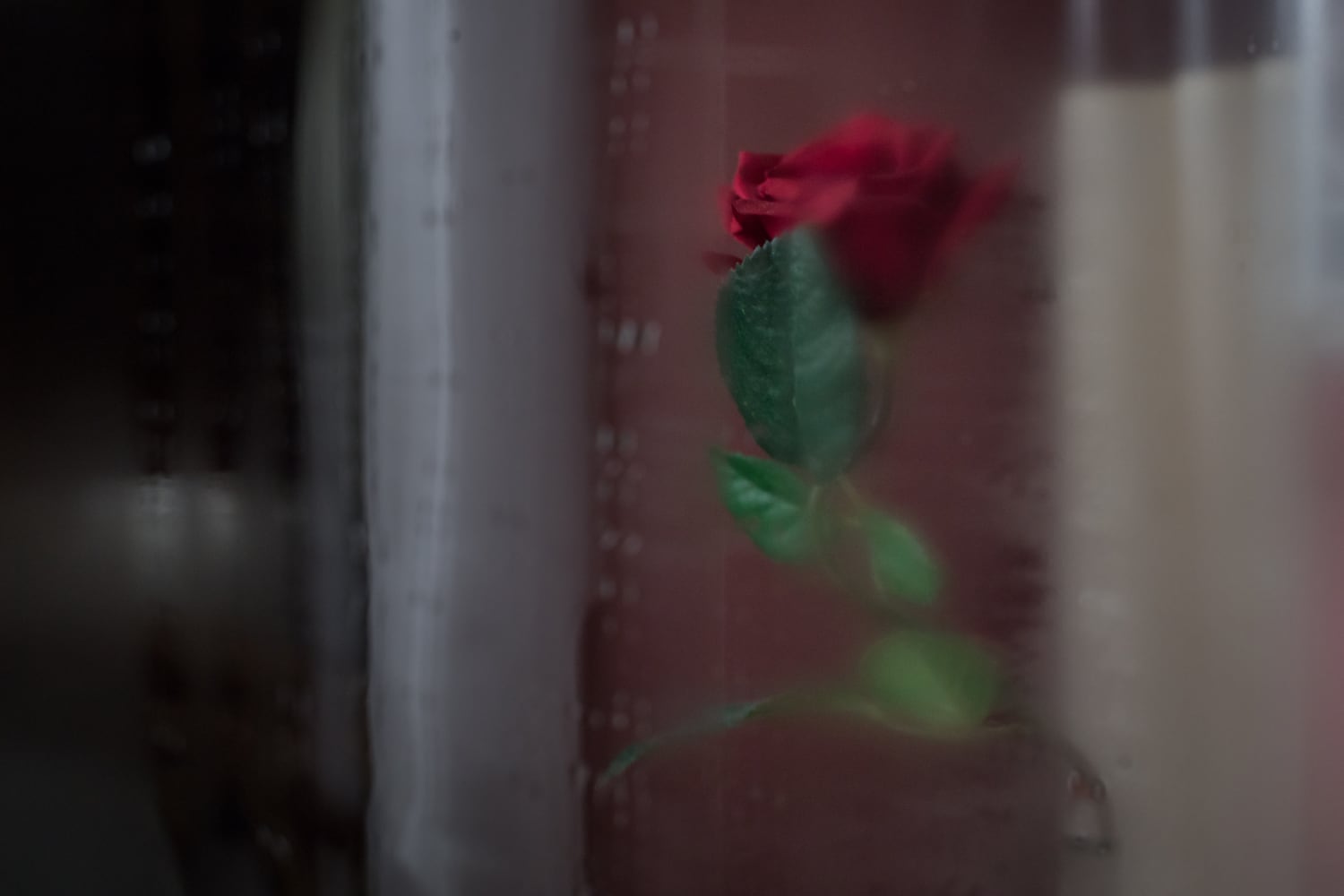 The day his probation was up, he sent me a dozen red roses. I felt like throwing them out! In my mind, there was nothing to celebrate. | Fake rose in a motel room in Lancaster County.