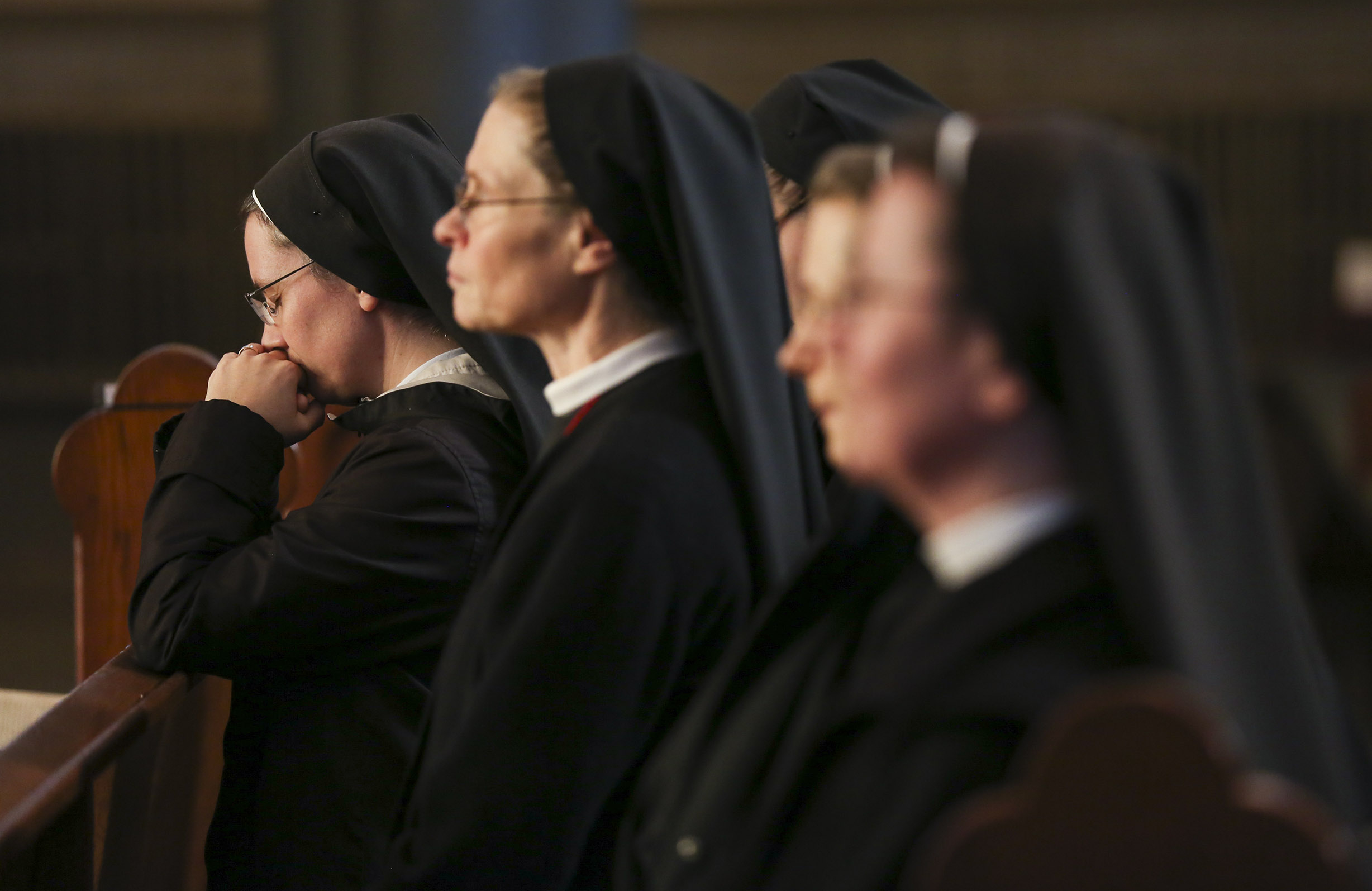 Sisters of Merciful Jesus’ Sr. Marie Therese Langer, ZSJM of Canada, left, kneels to pray as she sits alongside her fellow nuns, Sr. Rose Walatka, ZSJM, of Alaska, second from left, Superior General Sr. Joanna Kwiatkowska, ZSJM, of Poland, second from right, and Sr. Benedyleta Nowosad, ZSJM, of Canada, right, during their Mass Welcoming Sunday Nov. 25, 2018, at the St. Stanislaus Kostka Catholic Church. (Jessie Wardarski/Post-Gazette)