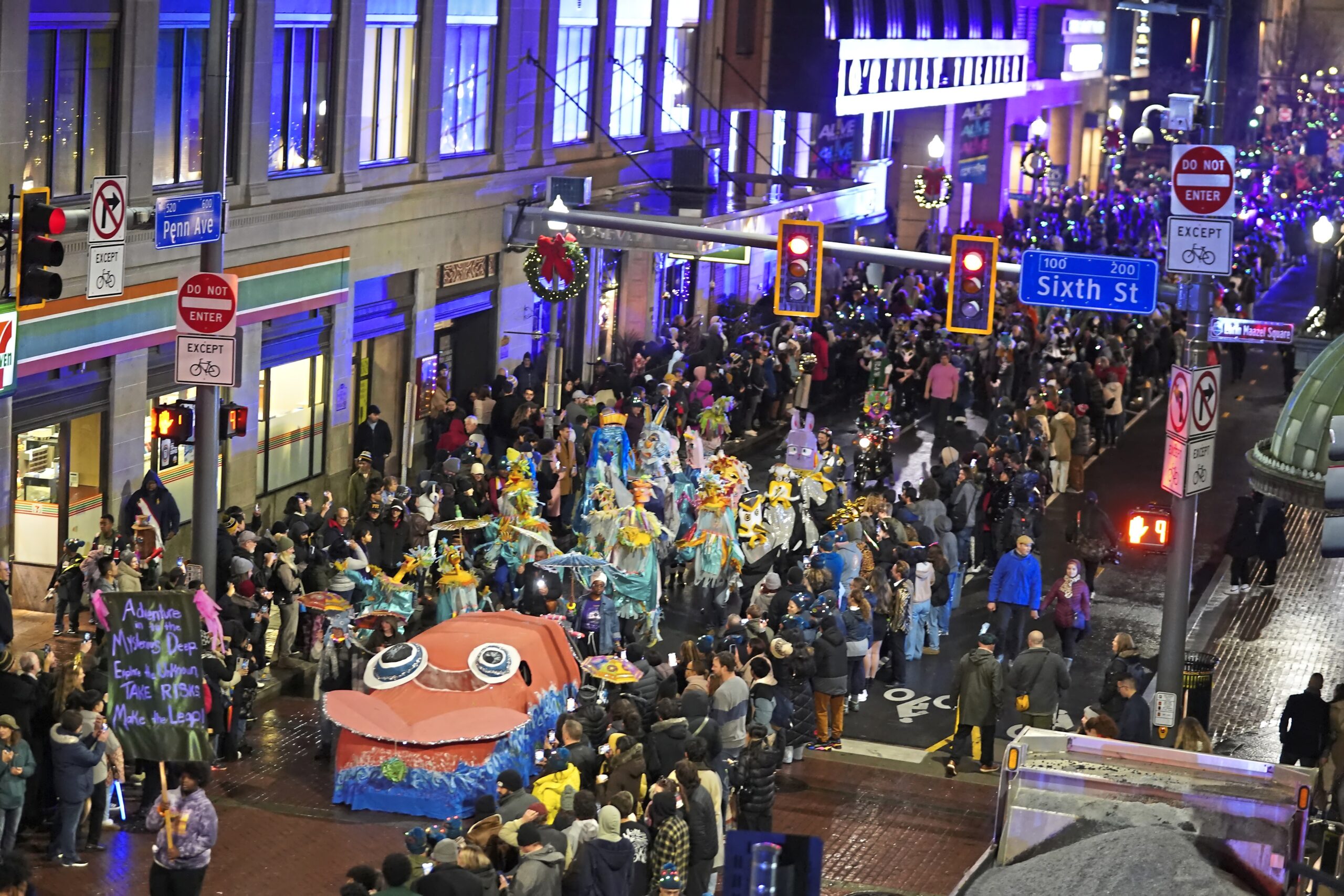 New Year’s Eve Parade marchers move down Penn Ave. during First Night Pittsburgh festivities Downtown Tuesday December 31, 2024