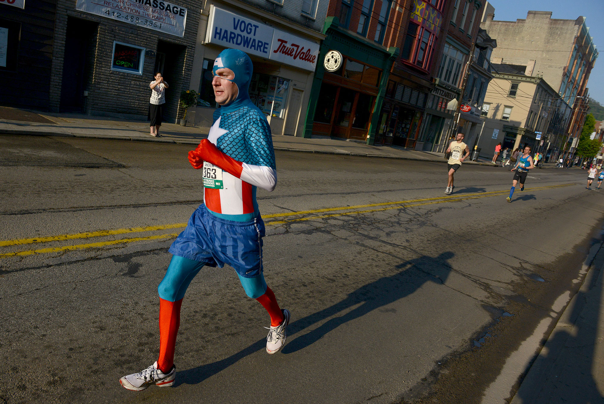 A marathon participant dressed as Captain America runs on Carson Street in the South Side during the 2015 Pittsburgh Marathon, on Sunday, May 3, 2015. (Michael Henninger/Post-Gazette)