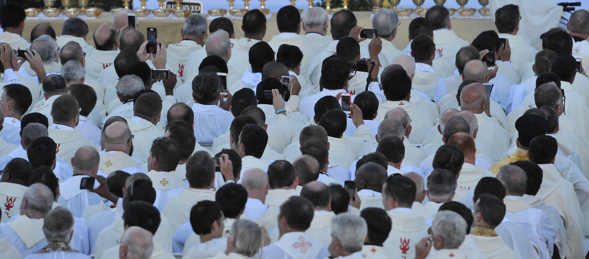 Priests pull out their phones as Pope Francis gives his homily during the canonization Mass for Junipero Serra at the Basilica of the National Shrine of the Immaculate Conception Wednesday.