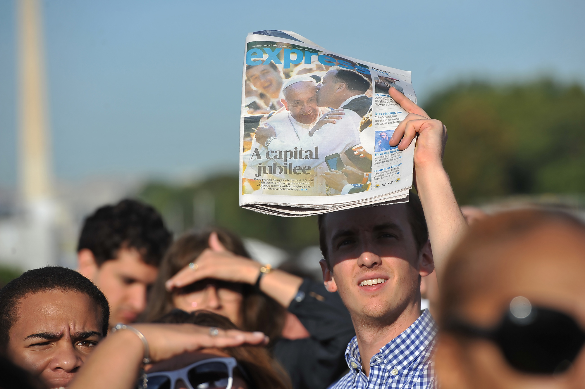 Spectators shield their eyes from the sun as they watch Jumbotrons where Pope Francis’ address to Congress is projected on Thursday.
