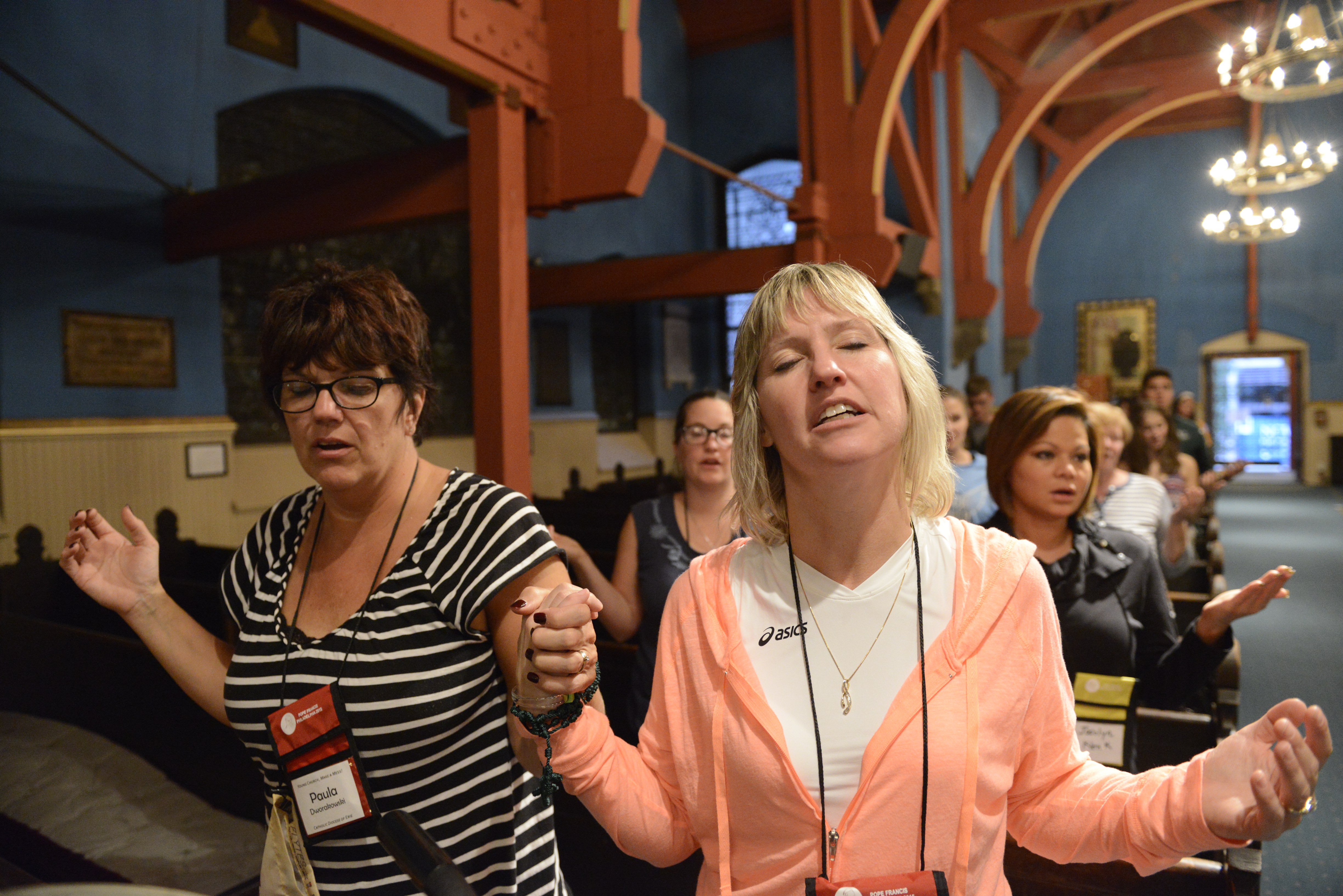 Paula Dworakowski , left, and Anne Osborn hold hands during a Mass conducted by Father Michael Roche for Pittsburgh and Erie area pilgrims at the First Unitarian Church in Philadelphia on Friday. The women came to Philadelphia with students from Mercyhurst Prep School.