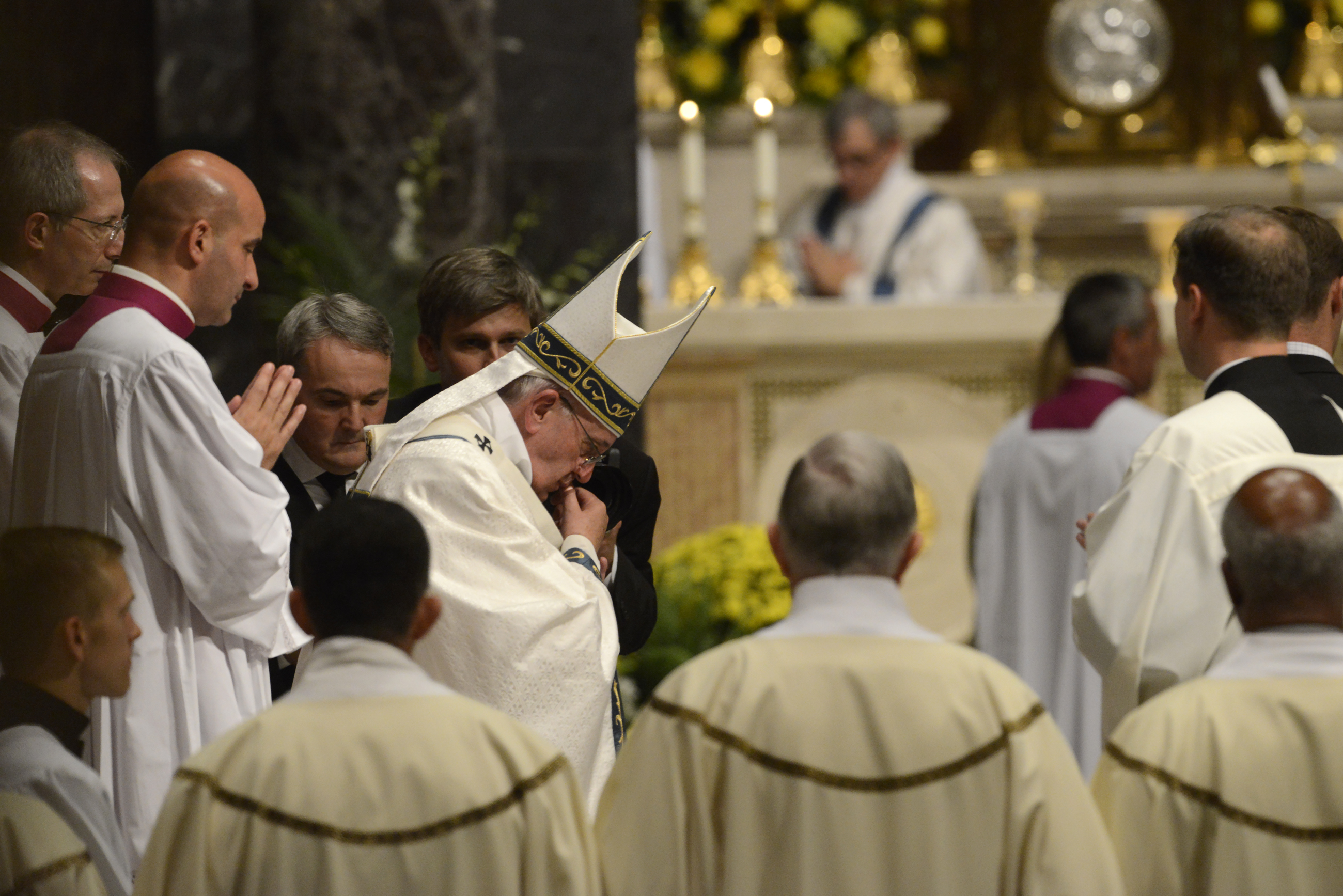 Pope Francis blesses several infants as he celebrates Mass with primarily Philadelphia area clergy, religious sisters and lay leaders at the Cathedral Basilica of Saints Peter and Paul in Philadelphia on Saturday.