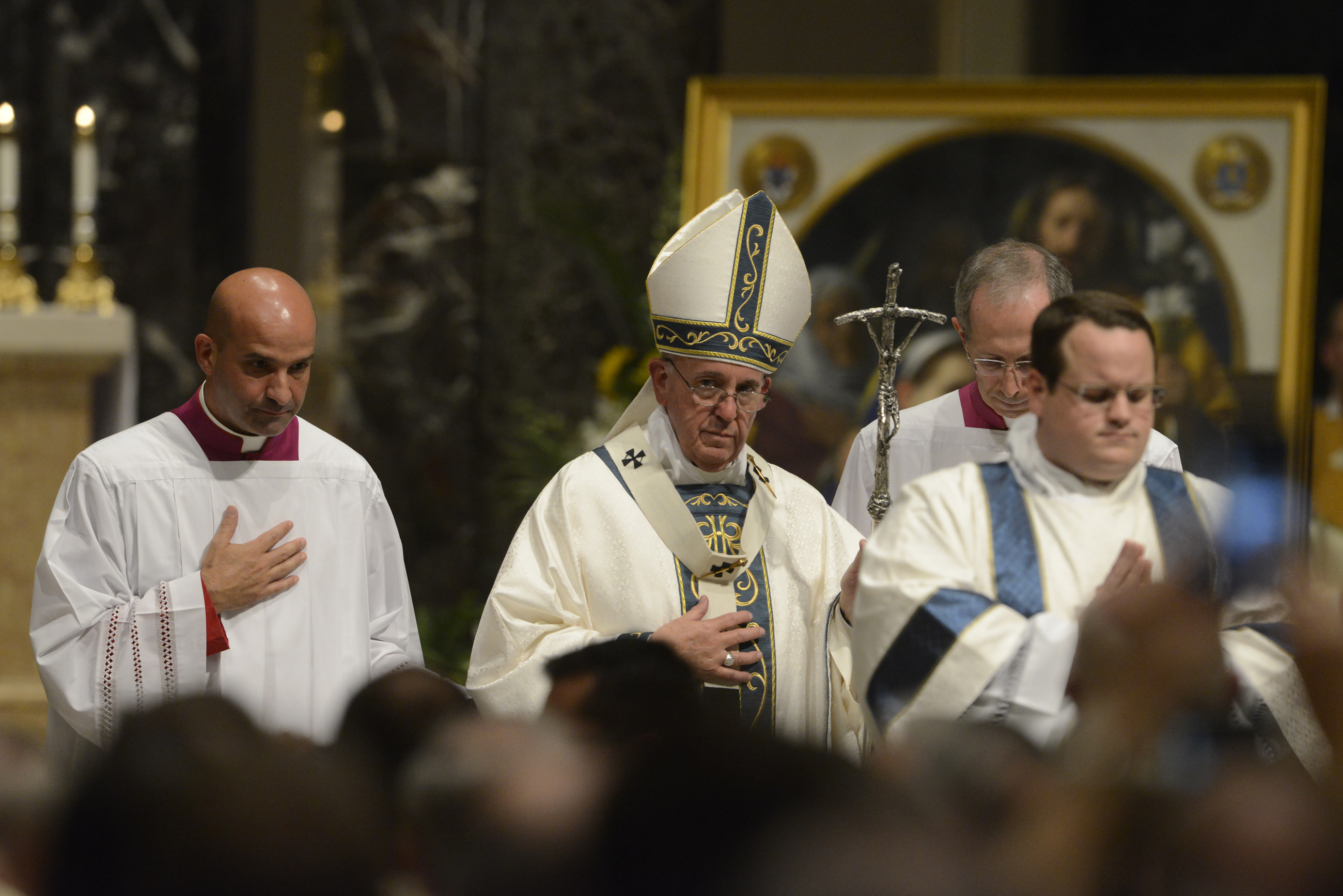Pope Francis leaves the Cathedral Basilica of Saints Peter and Paul after celebrating Mass in a packed house of 1,600 clergy, religious sisters and lay leaders in Philadelphia on Saturday.