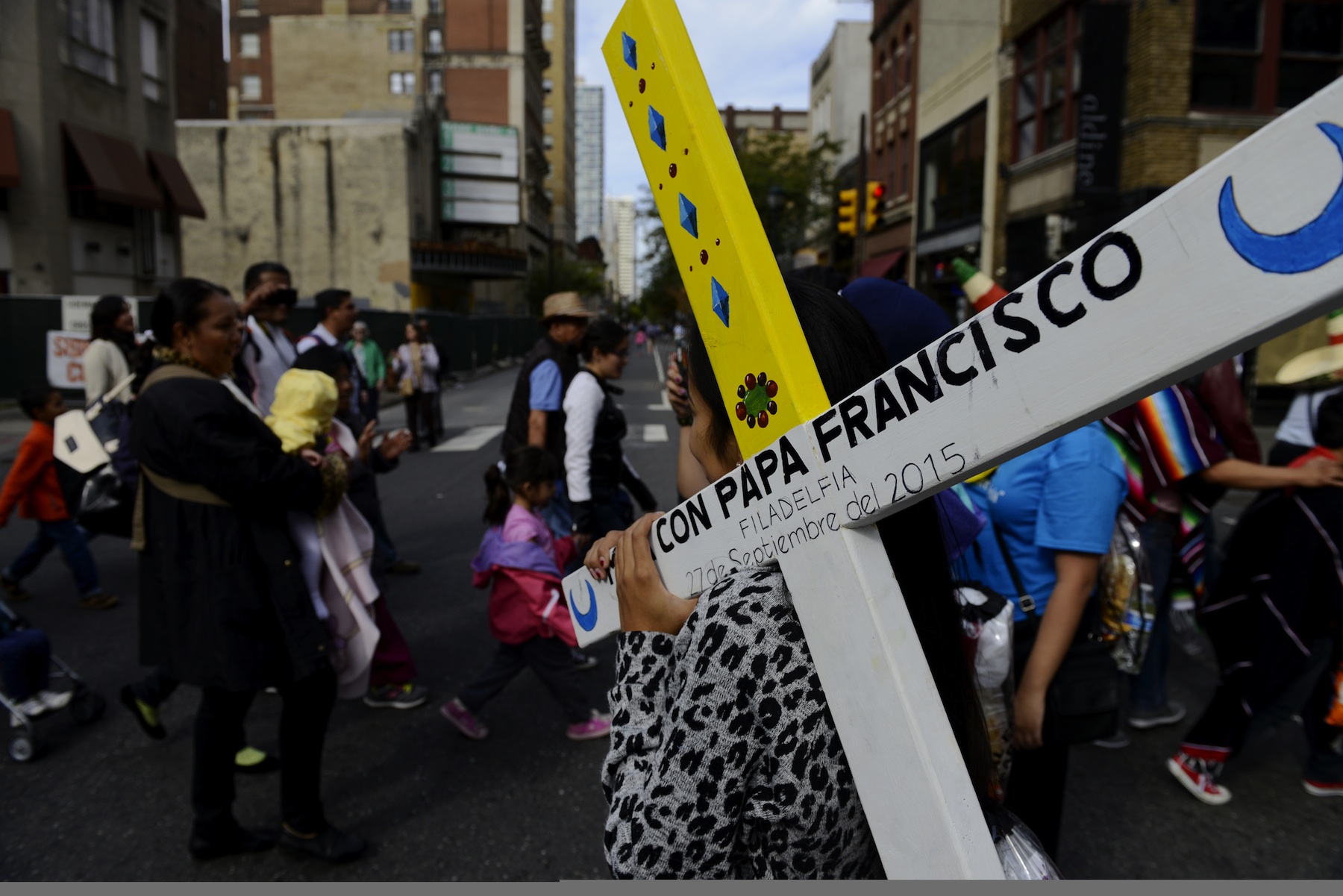 Sinai Flores of Kansas City, Mo., carries the cross of her diocese to get it blessed by Pope Francis during the public mass along the Benjamin Franklin Parkway in Philadelphia on Sunday, Sept. 27. (Rebecca Droke/Post-Gazette)