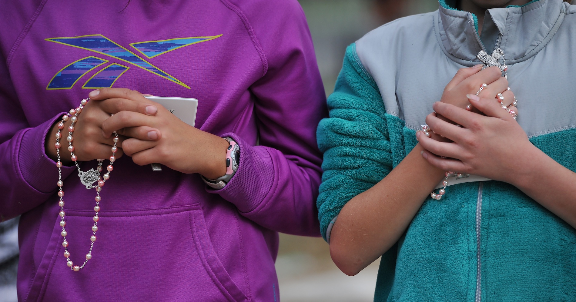 Christina Farrell, 11, left, and Kelly Besyna, 11, kneel on the concrete sidewalk as they listen to Mass celebrated by Pope Francis along the Benjamin Franklin Parkway Sunday, Sept. 27. Kelly Besyna said: “I feel so much closer to go God when I am holding the rosary,” and Christina agreed. (Rebecca Droke/Post-Gazette)