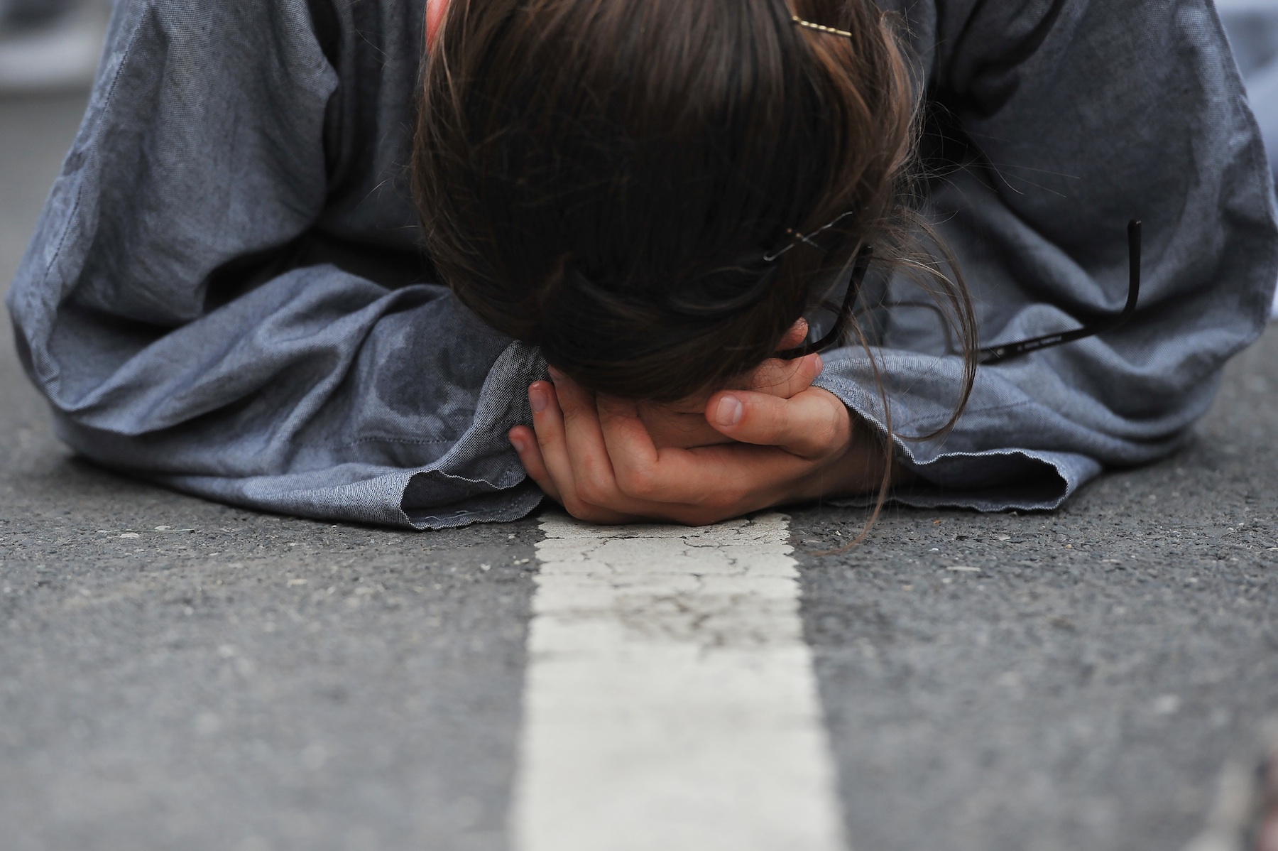 Anna Hogan of Bucks Co., bows over during Mass celebrated by Pope Francis along the Benjamin Franklin Parkway in Philadelphia on Sunday, Sept. 27. Ms. Hogan is a novice in the Apostolic Sisters of St. John in Princeville, Ill. (Rebecca Droke/Post-Gazette)