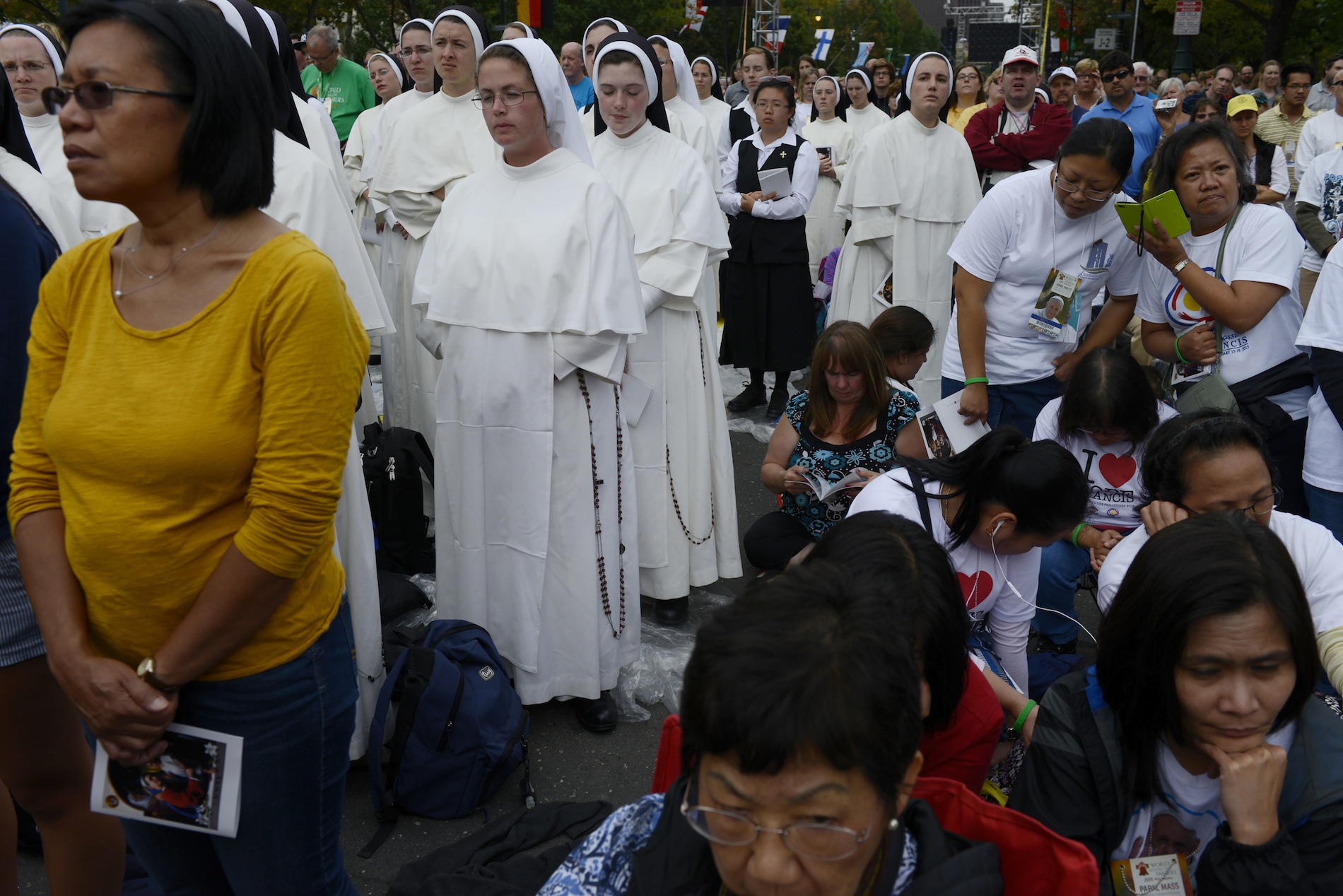 A diverse crowd listens to Pope Francis’ homily including women who listen on their phones to a translation, during an open air Mass along the Benjamin Franklin Parkway in Philadelphia on Sunday, Sept. 27. (Rebecca Droke/Post-Gazette)