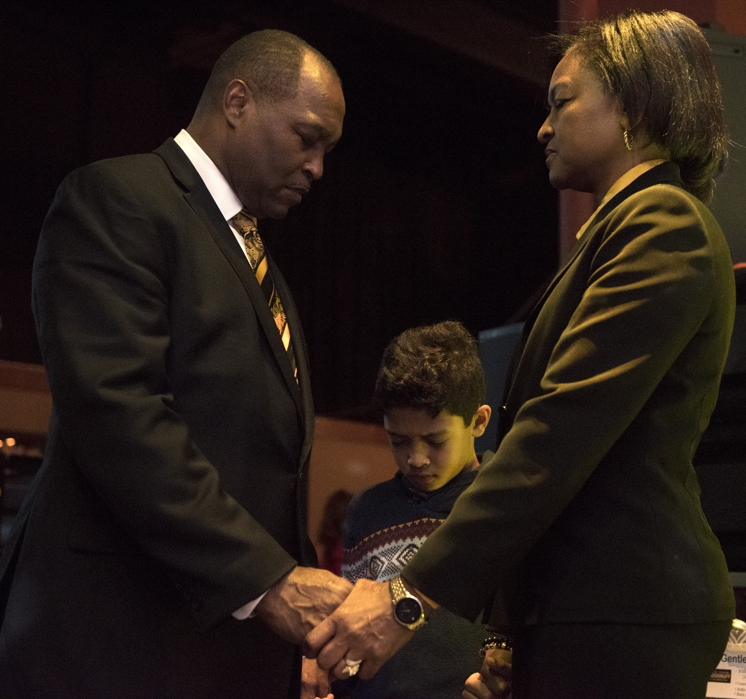 Judge Dwayne Woodruff, his wife, Joy, and his grandson, Jonah, 8, bow their heads in prayer before beginning their meal on Tuesday, Nov. 7, 2017, at the results party for the Judge Dwayne Woodruff PA Supreme Court race at Room 16 in the Strip District. (Haley Nelson/Post-Gazette)