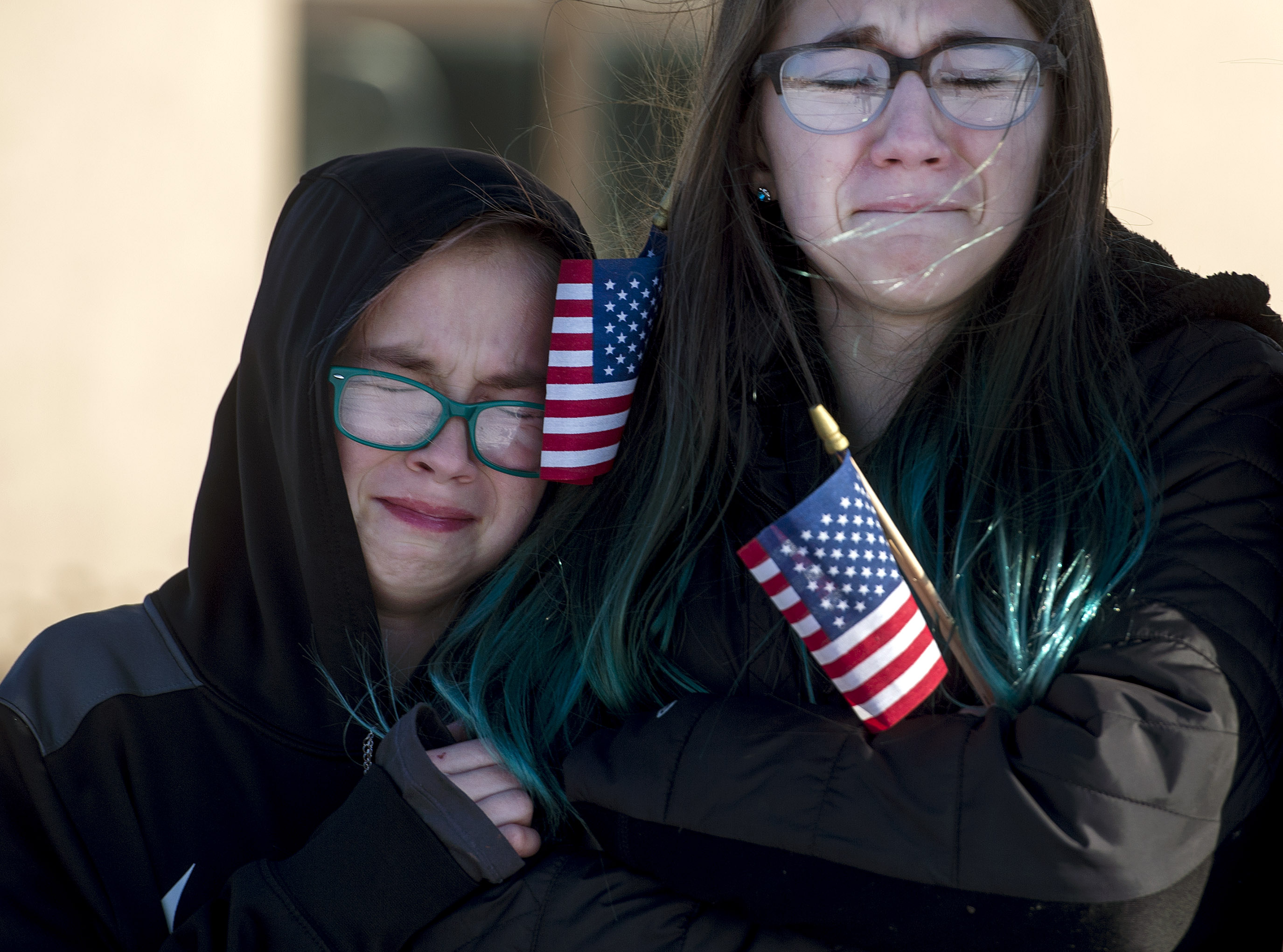 Gabby Karwowski, 10, and her sister Natalie Karwowski, 12, cry as a C-130 carrying their father Master Sgt. Christopher Karwowski returns from deployment on Friday, Jan. 19, 2018, at the 911th Airlift Wing in Coraopolis. (Steph Chambers/Post-Gazette)