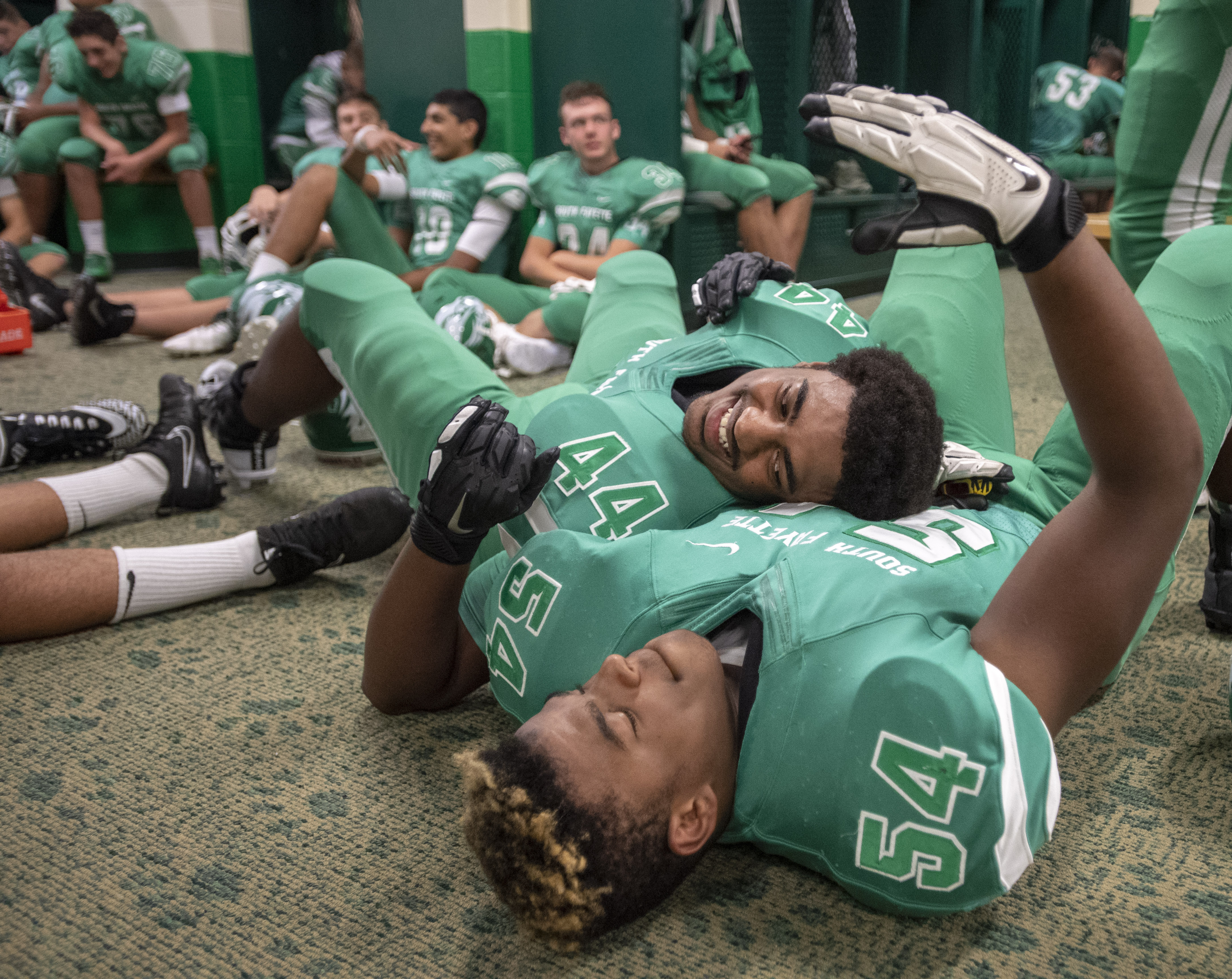 South Fayette’s Tremir Johnson and Keon Johnson share a moment before playing Blackhawk, Friday, Sept. 28, 2018, at South Fayette High School. (Steph Chambers/Post-Gazette)