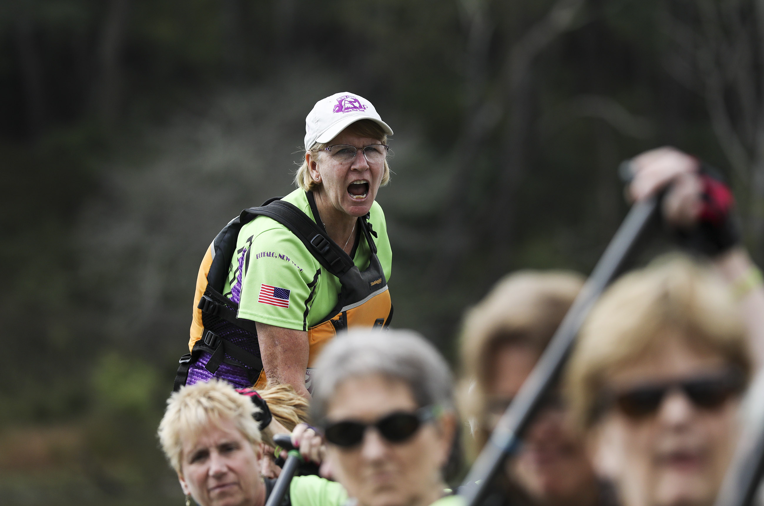 Anne Kist, center, captain of team “Hope Chest,” leads her racers during a 200 meter dragon boat race at the Pittsburgh Dragon Boat Festival, Sunday, Sept. 30, 2018, at North Park in McCandless. (Jessie Wardarski/Posjit-Gazette)