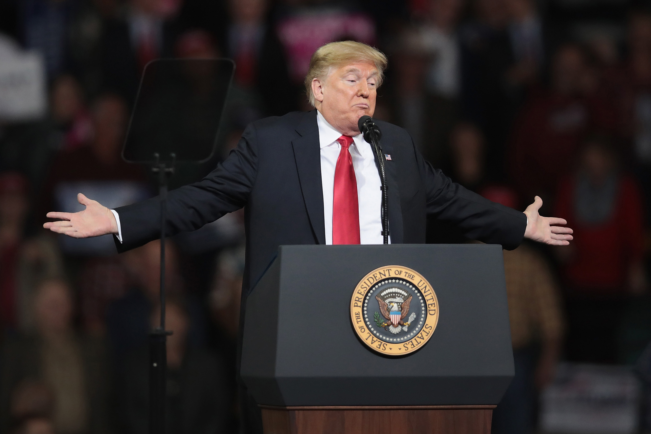 U.S. President Donald Trump speaks to supporters during a rally at the Kansas Expocenter on October 6, 2018 in Topeka, Kansas. Trump scored a political victory today when Judge Brett Kavanaugh was confirmed by the Senate to become the next Supreme Court justice. (Scott Olson/Getty Images)