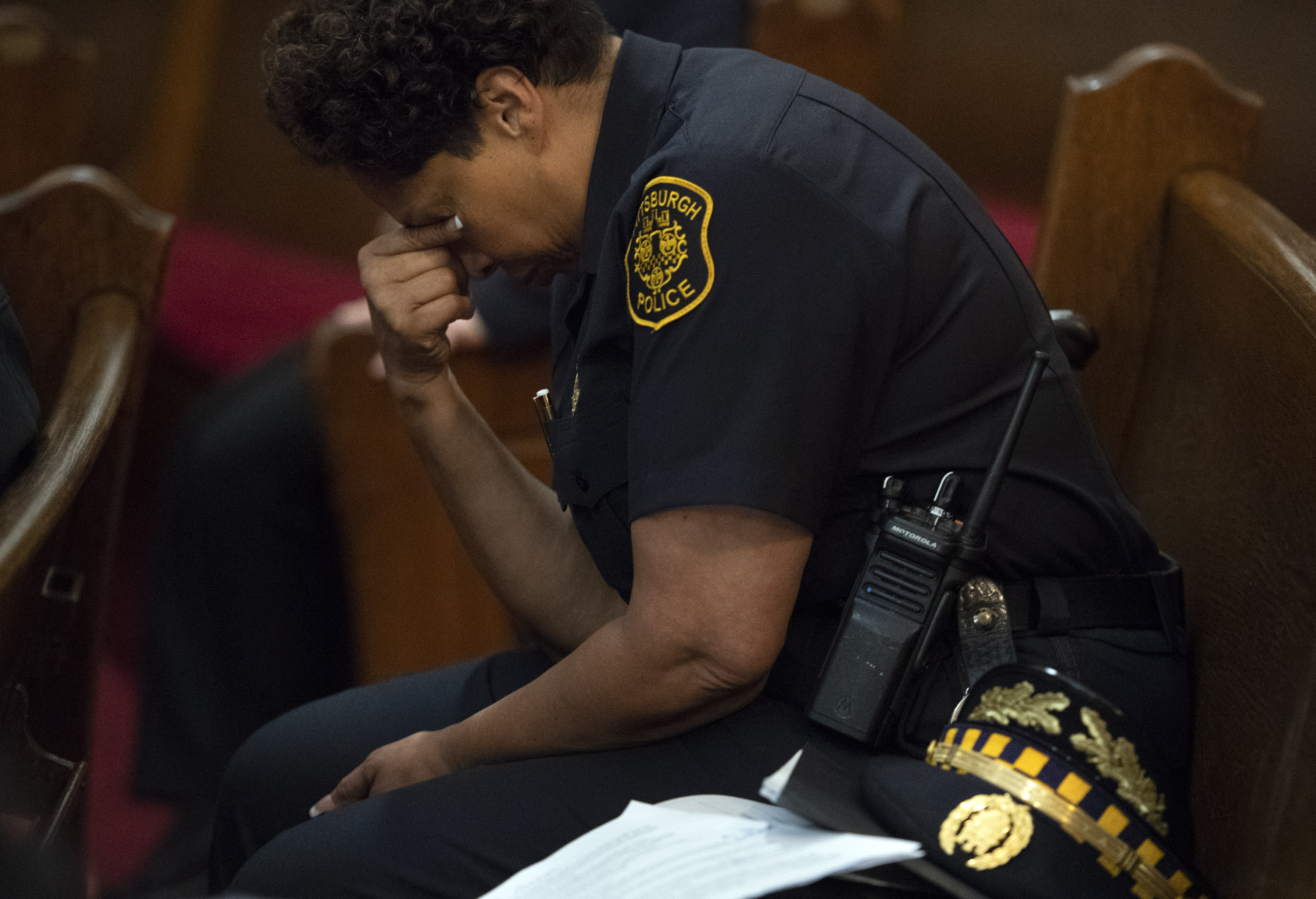 Lavonnie Bickerstaff, assistant chief of investigations for the Pittsburgh police, bows her head in prayer during an interfaith service, Tuesday, Oct. 16, 2018, at St. James A.M.E. Church in East Liberty. The service was hosted by the Black Political Empowerment Project, the Greater Pittsburgh Coalition Against Violence, Black Women for Positive Change, CeaseFirePA and Voices Against Violence. (Steph Chambers/Post-Gazette)