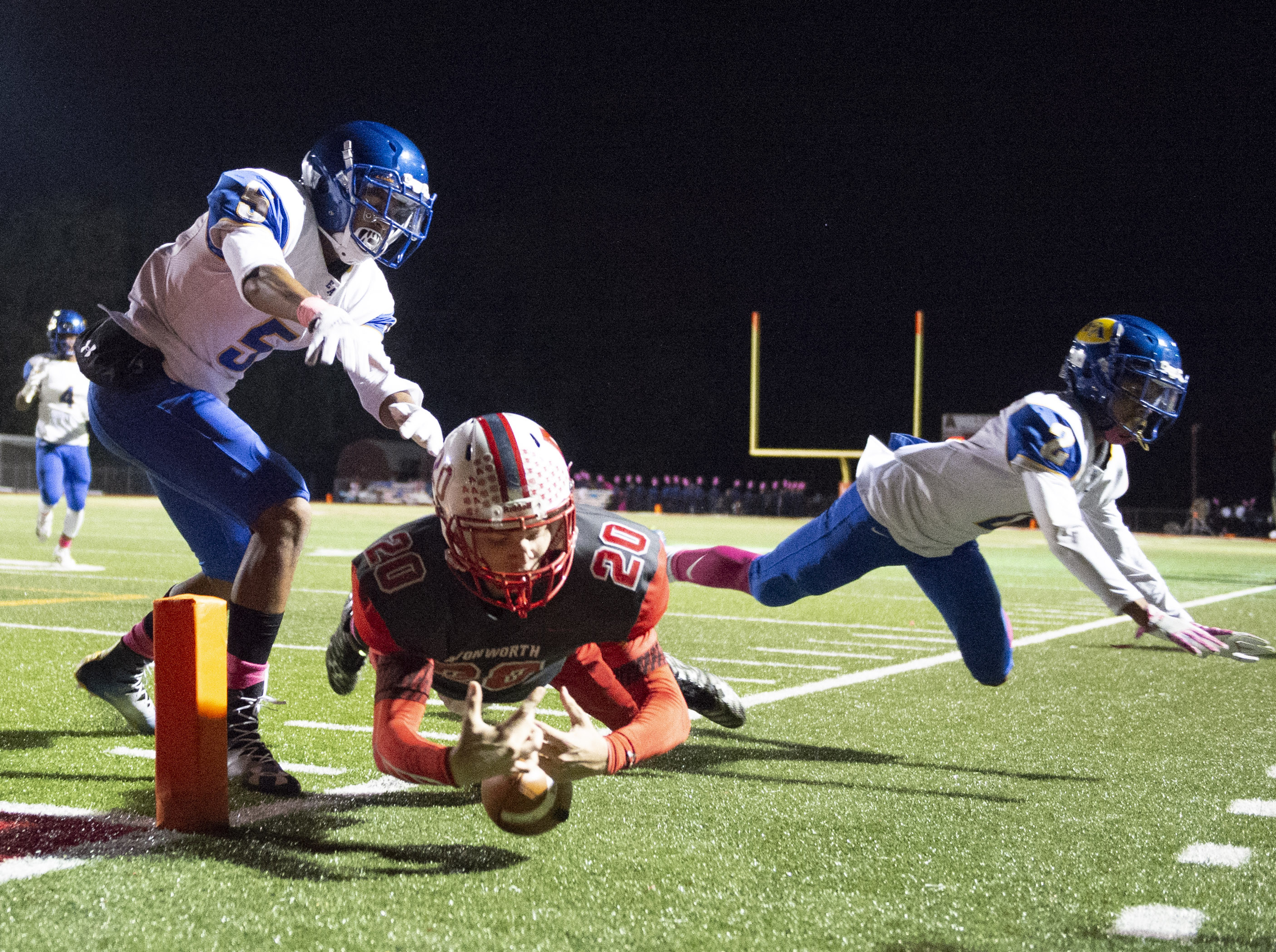 1018_WIP_09 October 18, 2018 • 3000 × 2239 • The week in photos: Oct. 12-18 East Alleghenys Ronnie McGrill pushes Avonworths Nick Weiser out of bounds, just shy of a touchdown, Friday, Oct. 12, 2018, at Avonworth High School. (Steph Chambers/Post-Gazette)