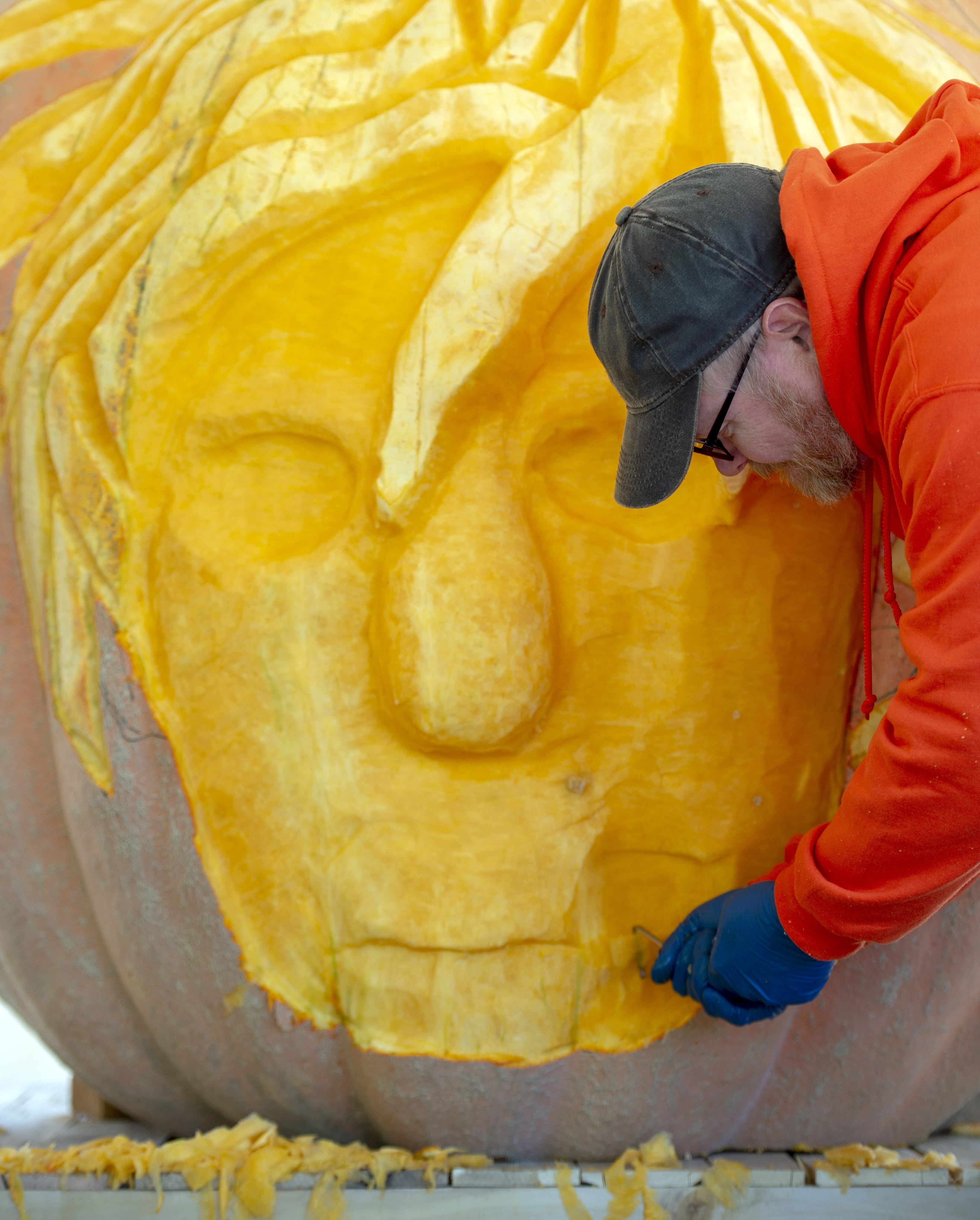 Dean Murray of West Richland, Wa. concentrates as he carves Andy Warhol onto a 1,674lb pumpkin from Buffalo on Thursday, Oct. 18, 2018, ahead of this weekend’s inaugural Pittsburgh Monster Pumpkins Festival in the North Shore. (Steph Chambers/Post-Gazette)