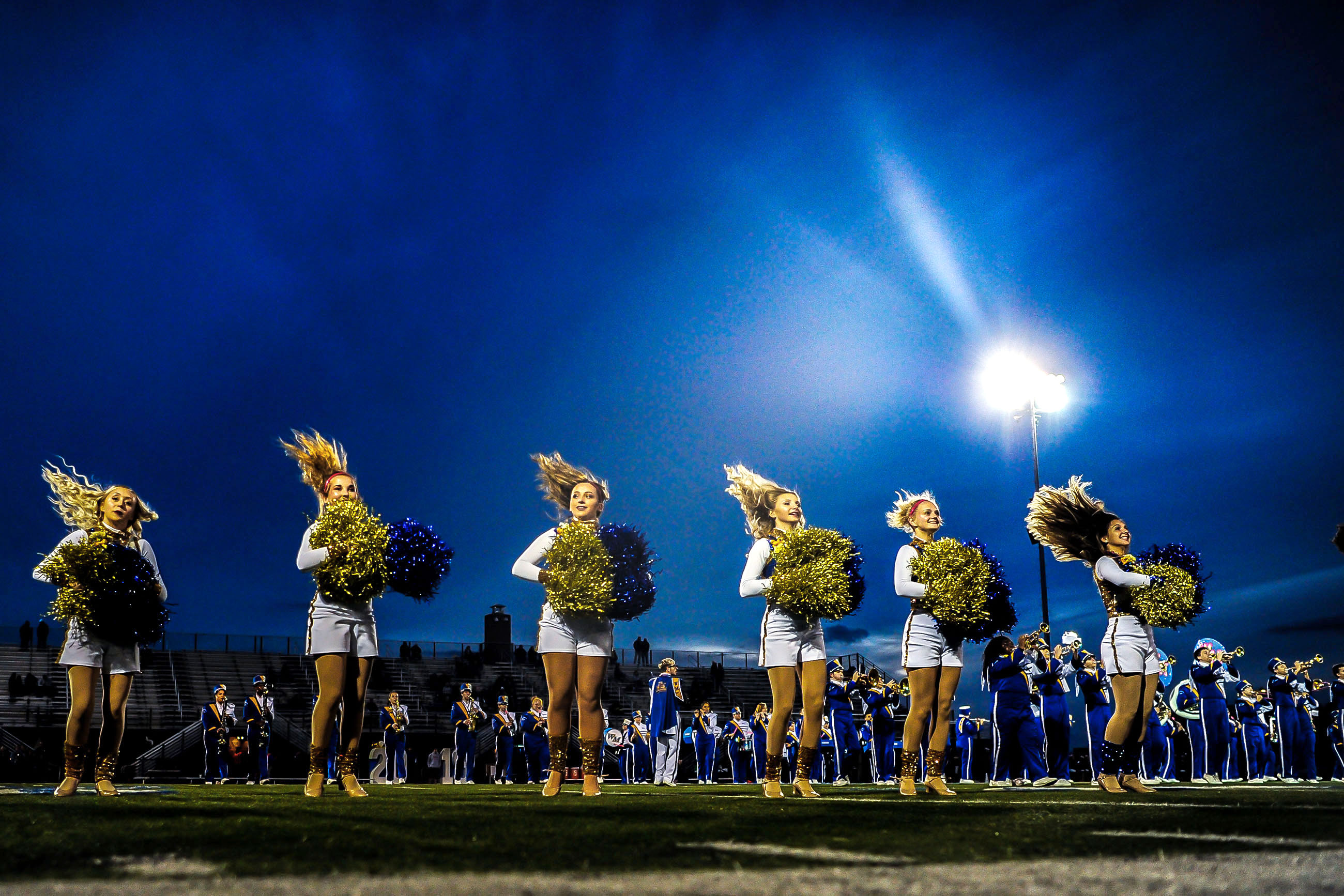 West Mifflin’s band and cheer, dance and flag teams perform before a game against Belle Vernon, Friday, October 12, 2018, at West Mifflin High School in West Mifflin. (Alexandra Wimley/Post-Gazette)