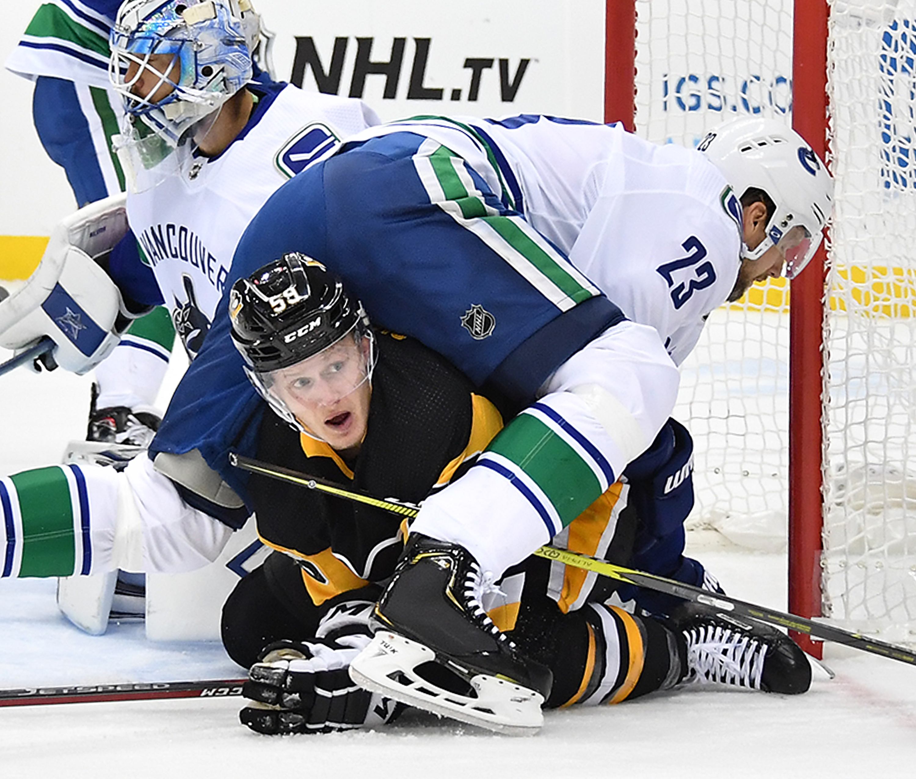 Penguins forward Jake Guentzel looks for a call from the referee as the Canucks’ Alexander Edler holds him down in front of the net, Tuesday Oct. 16, 2018, at PPG Paints Arena. (Peter Diana/Post-Gazette)