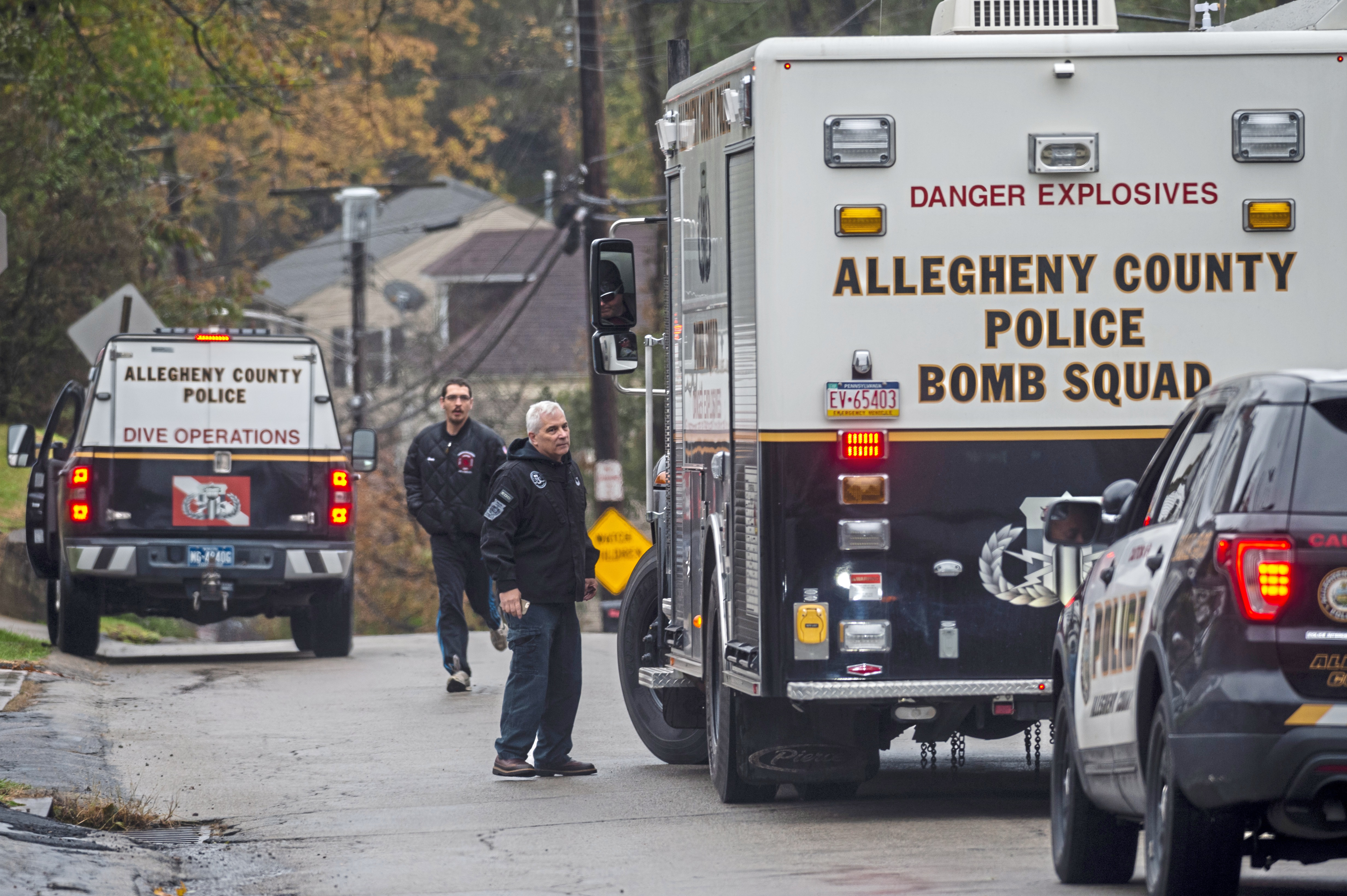 Members of the Allegheny County Police Bomb Squad arrive at the 5300 block of McAnulty Road in Baldwin on Saturday, Oct. 27, 2018, to assist the ATF and local authorities in searching a residence possibly associated with Robert Bowers, a suspect in the shooting at the Tree of Life Congregation Synagogue in Squirrel Hill. (Michael Santiago/Post-Gazette)