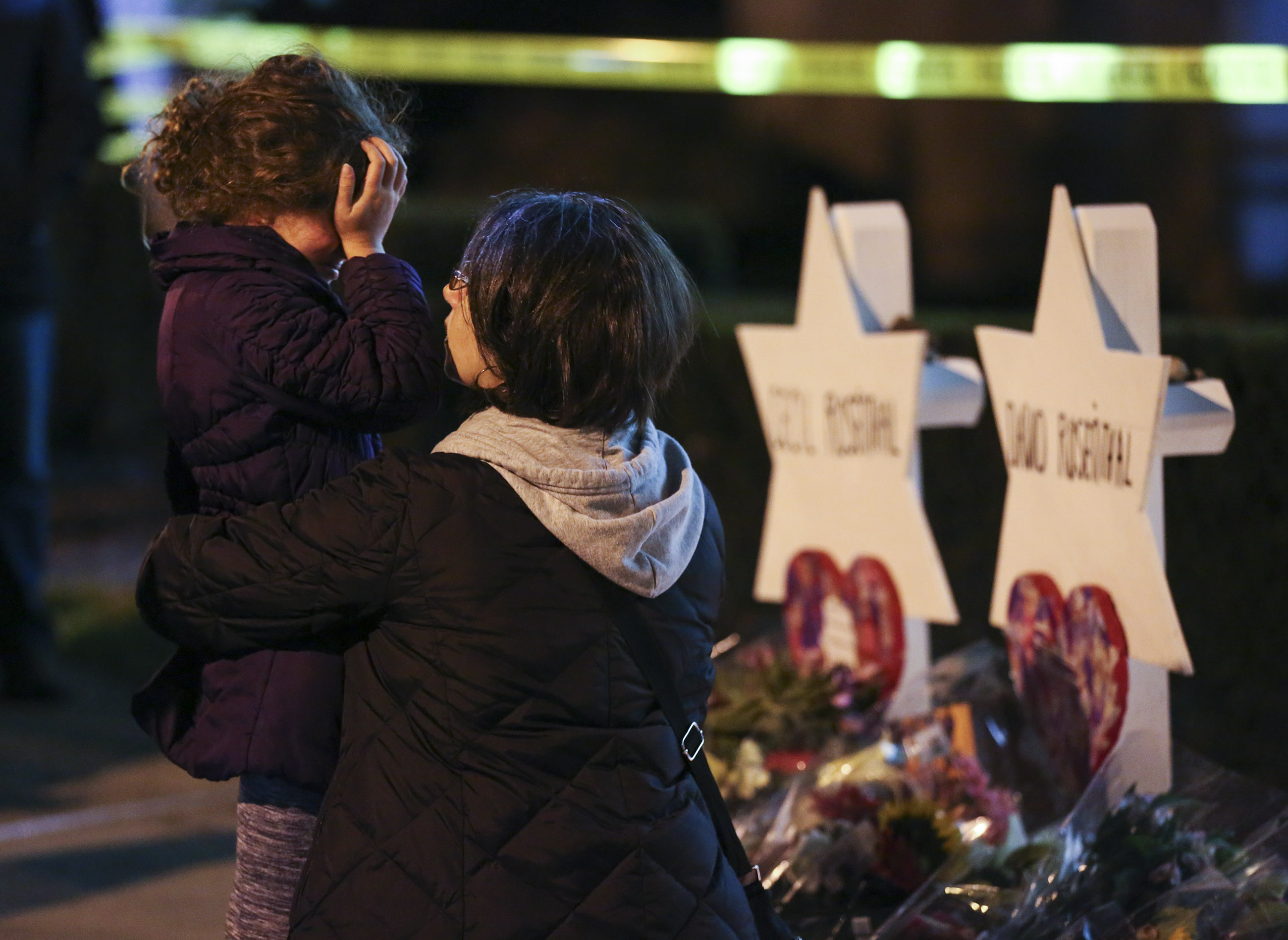 Nora Schindler, 9, left, covers her eyes as she cries into her mom Jamie Beth Schindler’s, 43, hug, both of Lancaster, as they kneel in front of the memorial for the eleven deceased victims of the shootings that took place at the Tree of Life Synagogue on Saturday, Monday evening Oct. 29, 2018, outside the Tree of Life Synagogue in Squirrel Hill. (Jessie Wardarski/Post-Gazette)