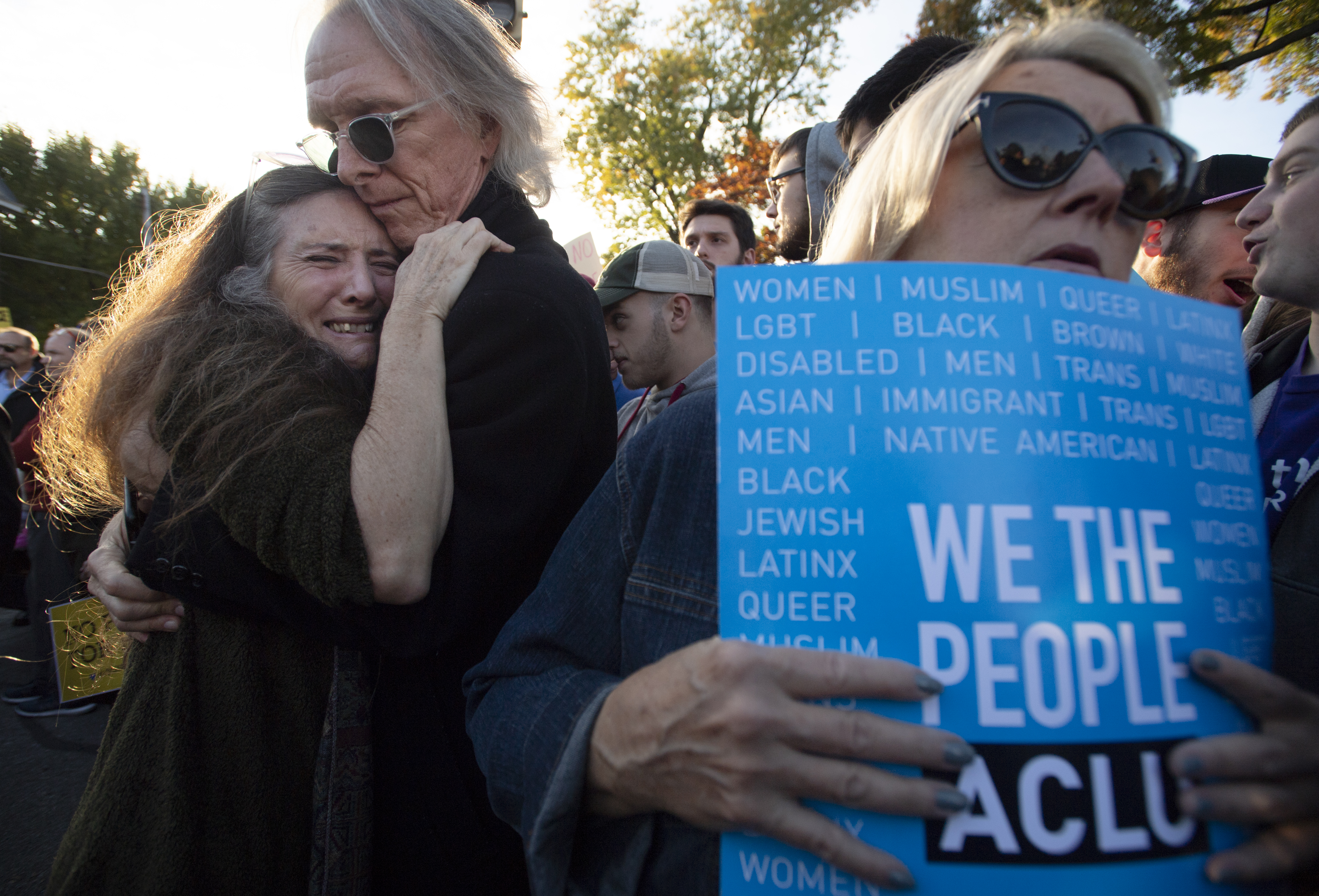 Susan Spangler and Ted Cmarada of Friendship cry as thousands march along Shady Avenue in opposition of President Donald Trump’s visit to Pittsburgh on Tuesday, Oct. 30, 2018, in Squirrel Hill. (Steph Chambers/Post-Gazette)