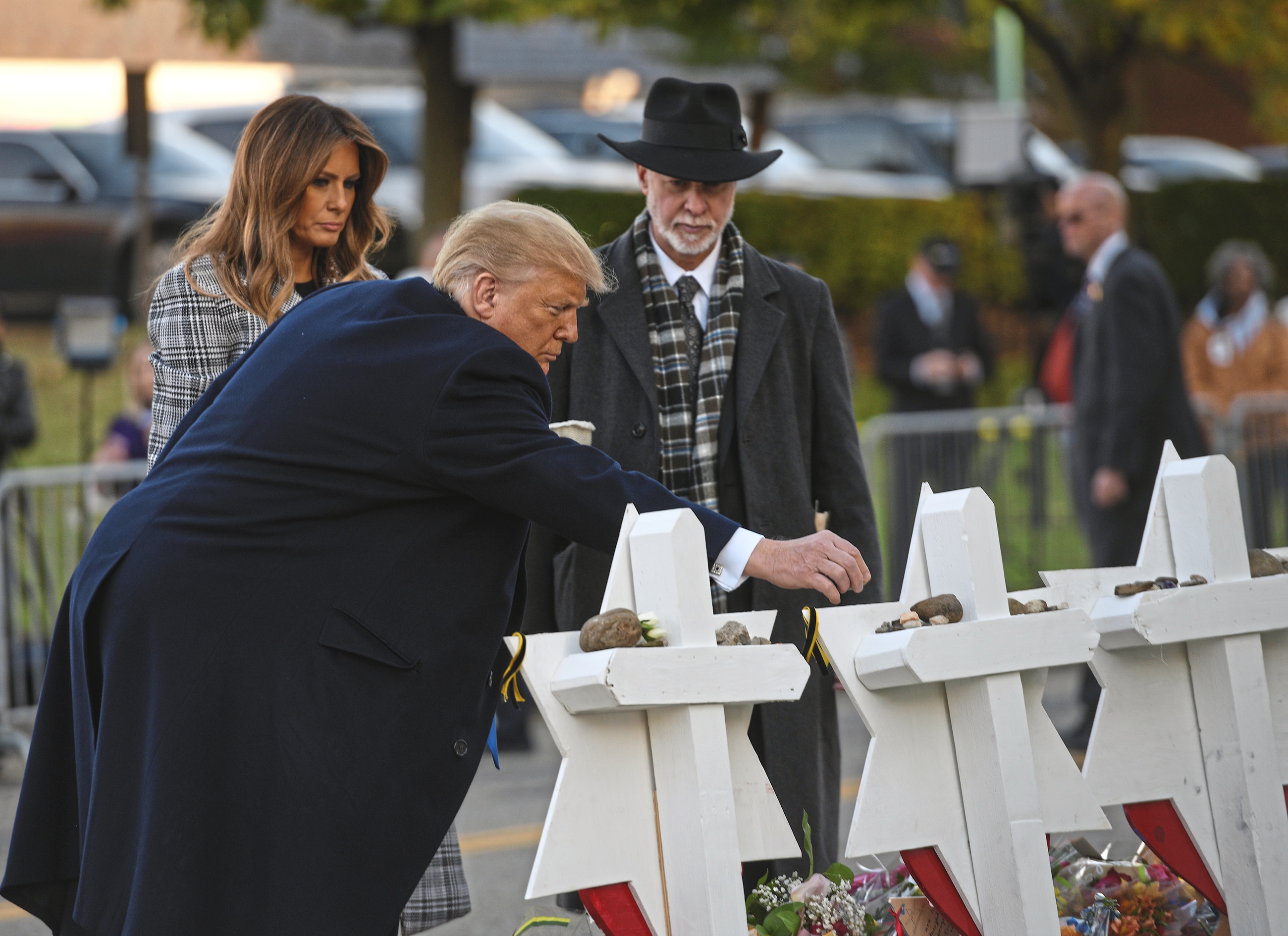 President Donald Trump and First Lady Melania lay stones and flowers at a memorial for victims of the massacre at Tree of Life synagogue in Squirrel Hill on Tuesday, Oct. 30, 2018. At right is Rabbi Jeffrey Myers, who survived the shooting event. Three days before the visit, on Saturday, Oct. 27, 2018, a gunman killed 11 people at the synagogue. (Steve Mellon/Post-Gazette)