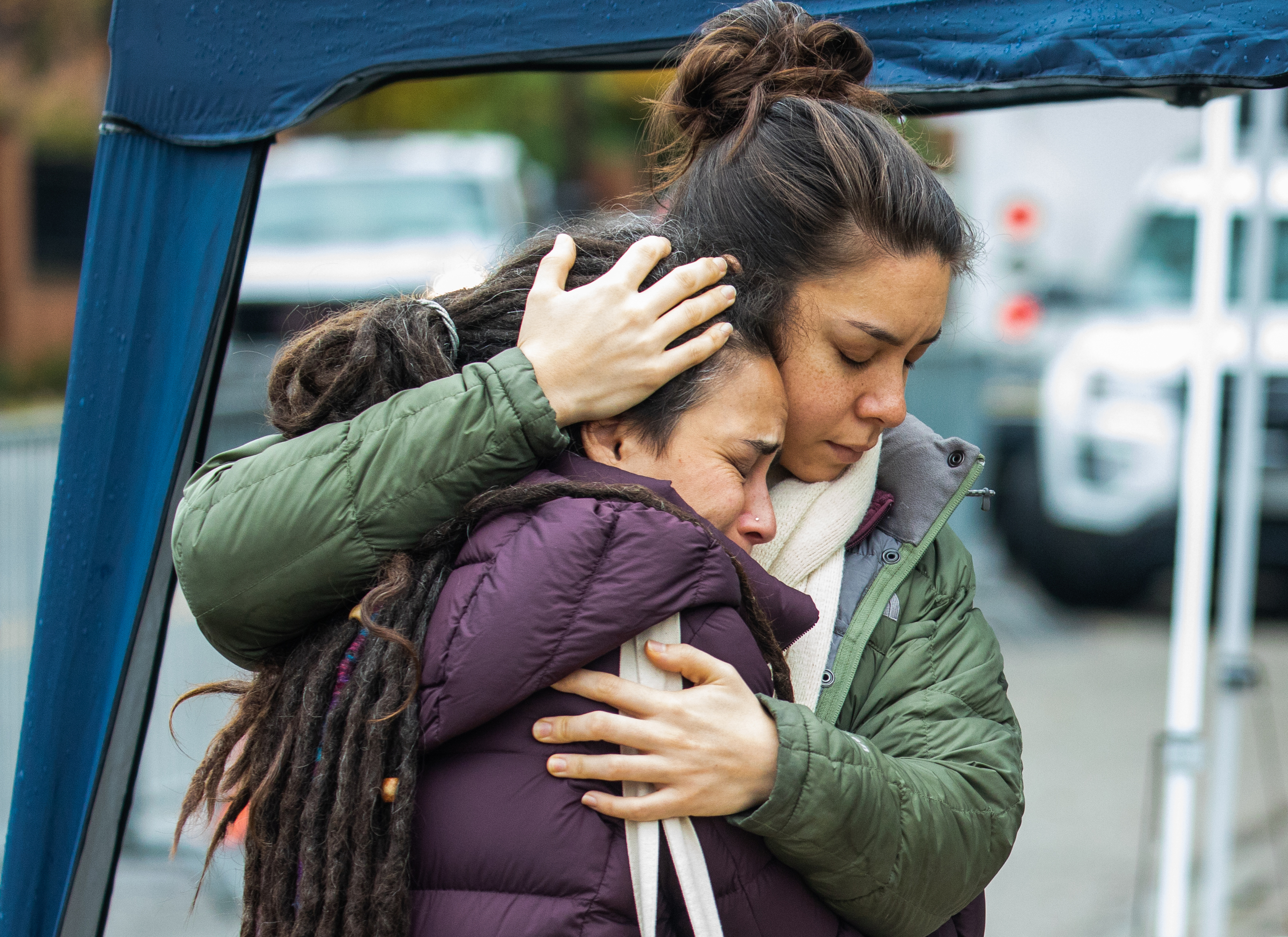 Rachel Gross, right, of Squirrel Hill, hugs her sister Kohenet Keshira haLev Fife at the memorial for the victims of the mass shooting at the Tree of Life synagogue, Thursday, Nov. 1, 2018, in Squirrel Hill. The sisters grew up attending the Tree of Life synagogue. (Andrew Rush/Post-Gazette)