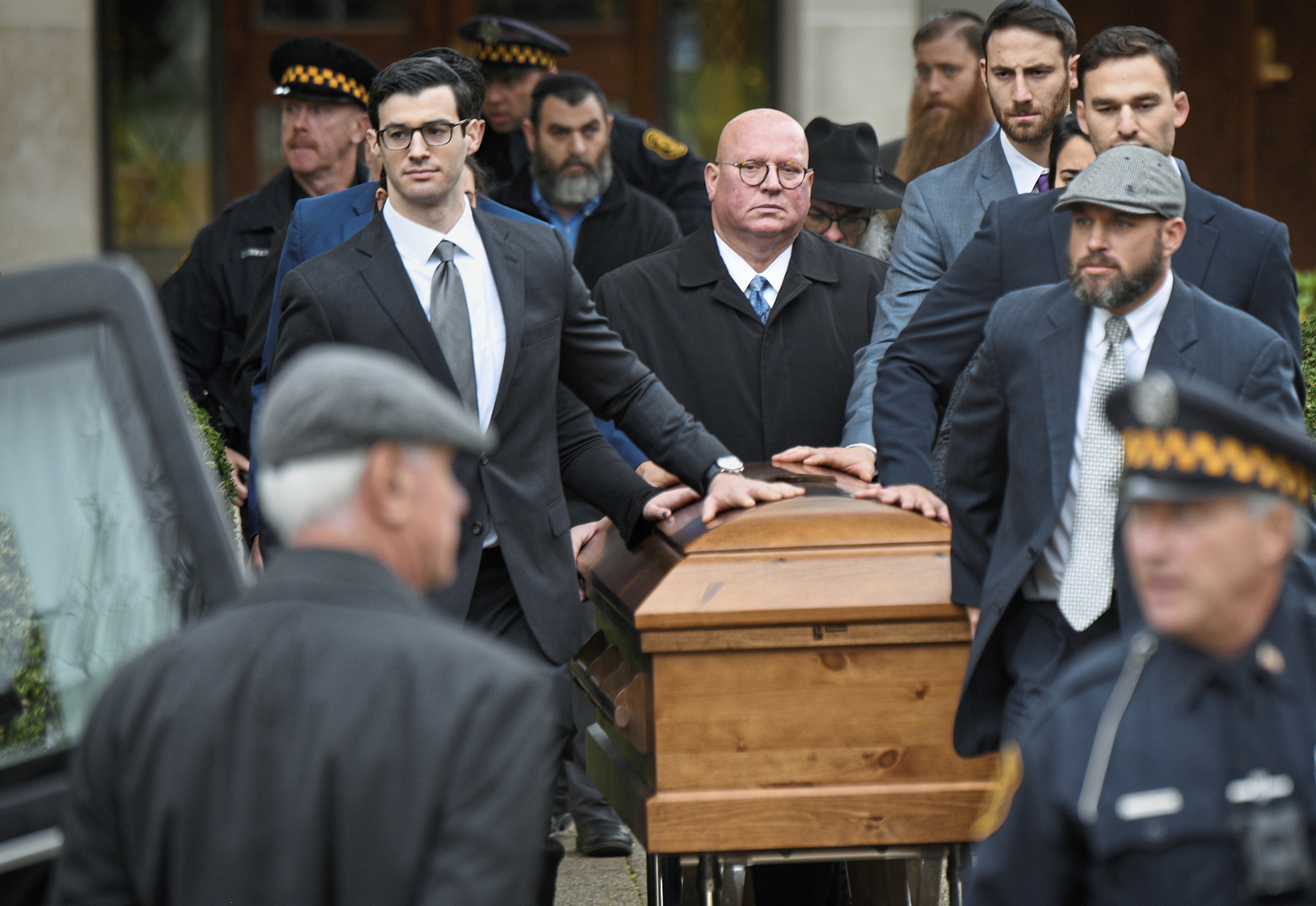 Pall bearers on Friday, Nov. 2, 2018, carry the casket of Rose Mallinger from Rodef Shalom Temple in Shadyside for the funeral of Rose Mallinger, 97, who died in the Tree of Life synagogue massacre in Squirrel Hill. The shooting took place Saturday, Oct. 27, 2018. (Steve Mellon/Post-Gazette)