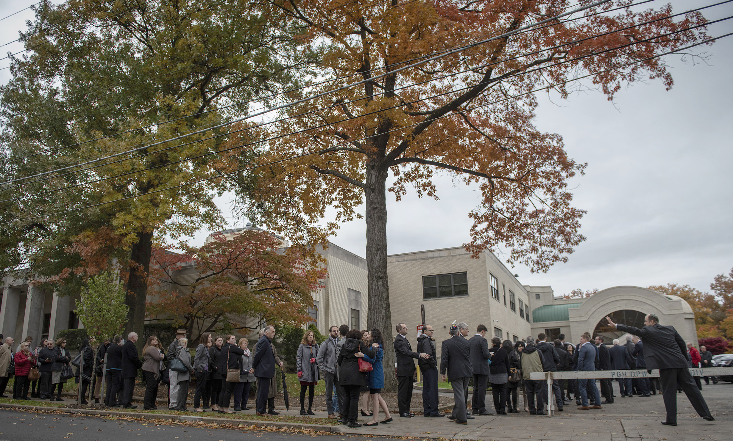 Mourners gather for the funeral of Rose Mallinger, 97, one of 11 victims of the Tree of Life synagogue massacre, Friday, Nov. 2, 2018, at Congregation Rodef Shalom in Shadyside. Mallinger is the last victim to buried after the Oct. 27 shooting. (Steve Mellon/Post-Gazette)