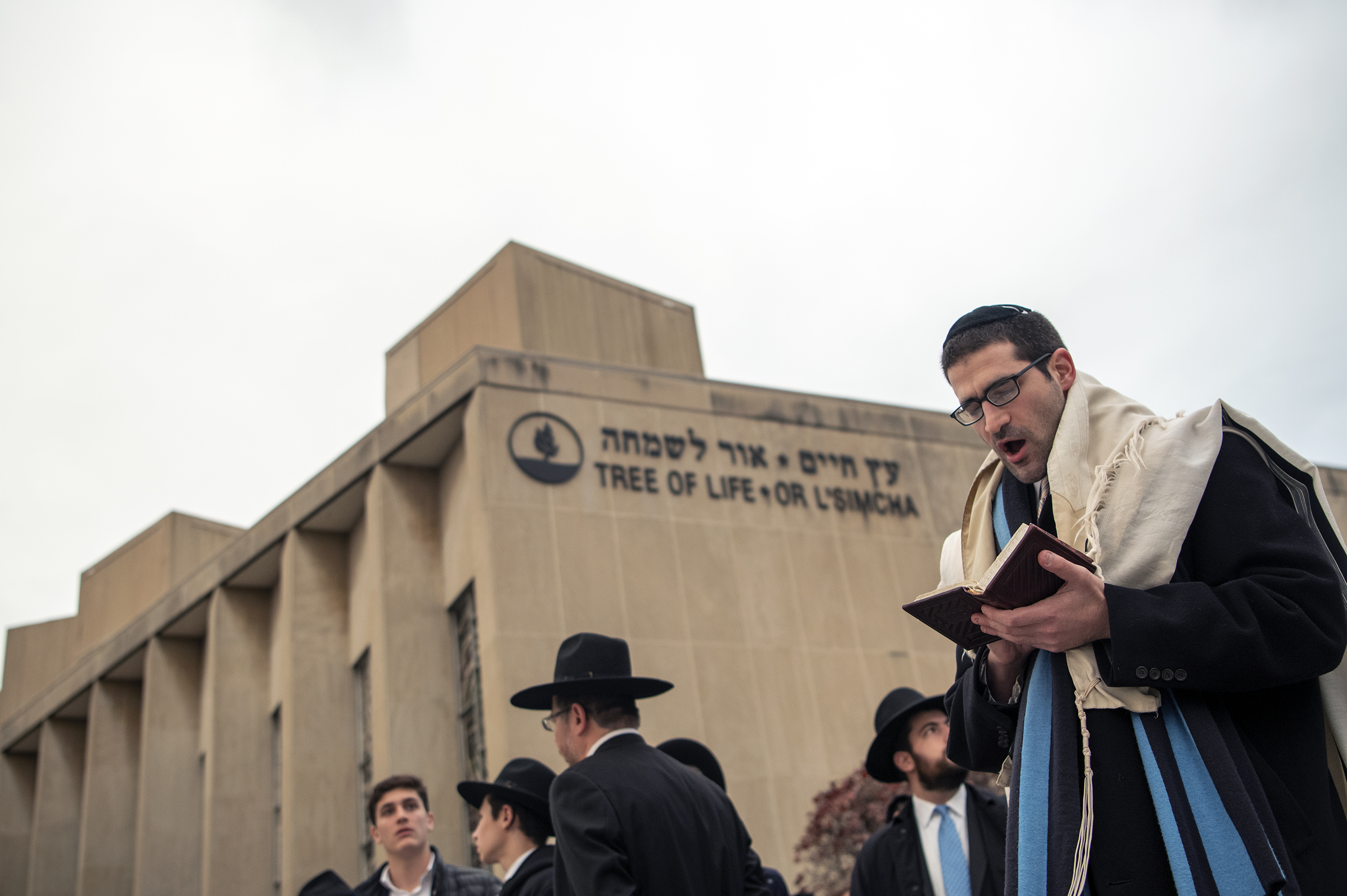 Schmuel Eisenberg leads the first Shabbat prayer service, outside of the Tree of Life synagogue, Friday, Nov. 2, 2018, in Squirrel Hill, since 11 people were killed last Saturday, Oct. 27. (Alexandra Wimley/Post-Gazette)
