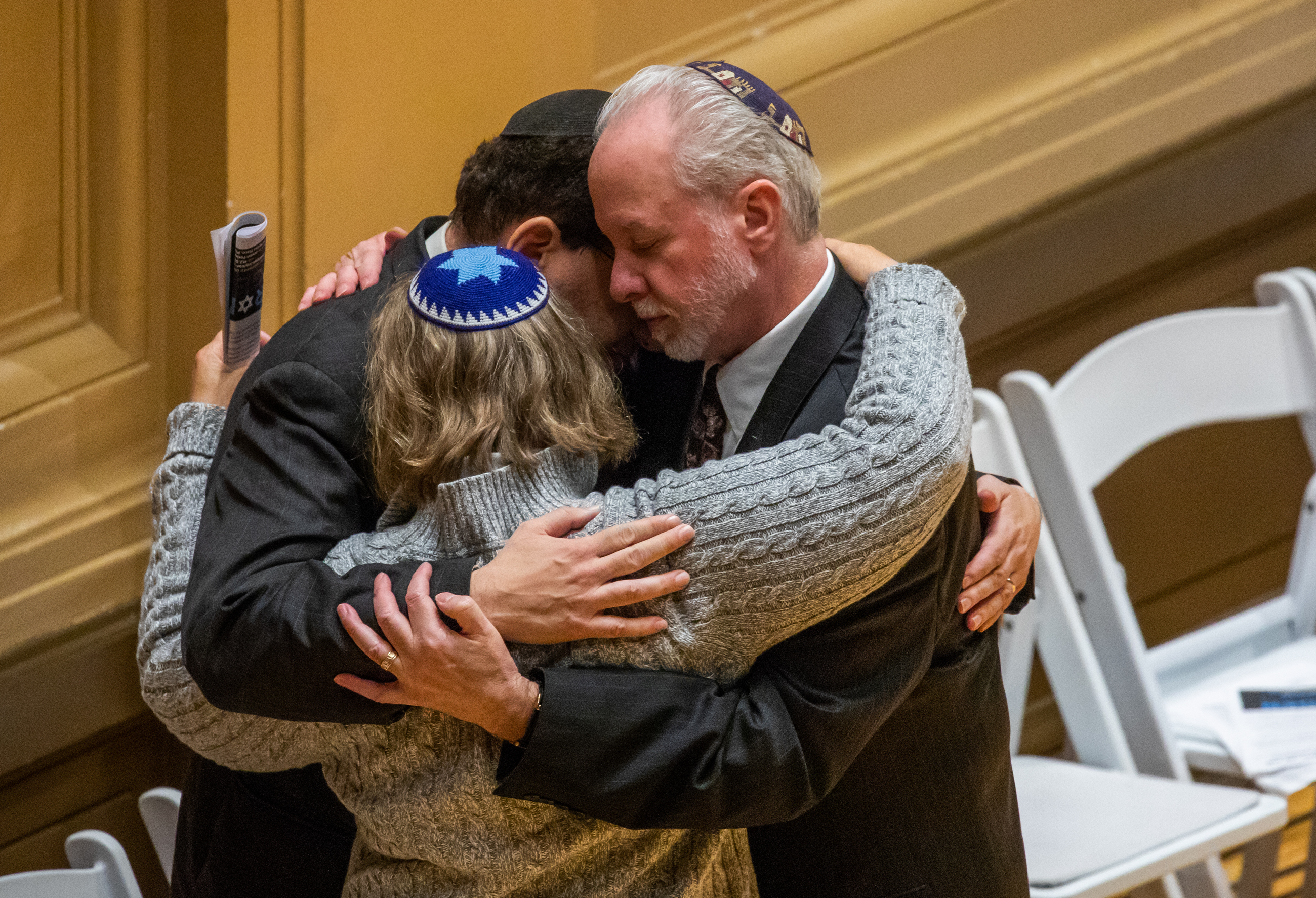 From left, Rabbi Cheryl Klein of the Dor Hadash Congregation, Rabbi Jonathan Perlman of the New Light Congregation and Rabbi Jeffrey Myers of the Tree of Life Congregation hug after a vigil remembering the victims, Sunday, Oct. 28, 2018, Soldiers & Sailors Memorial Hall and Museum in Oakland. (Andrew Rush/Post-Gazette)