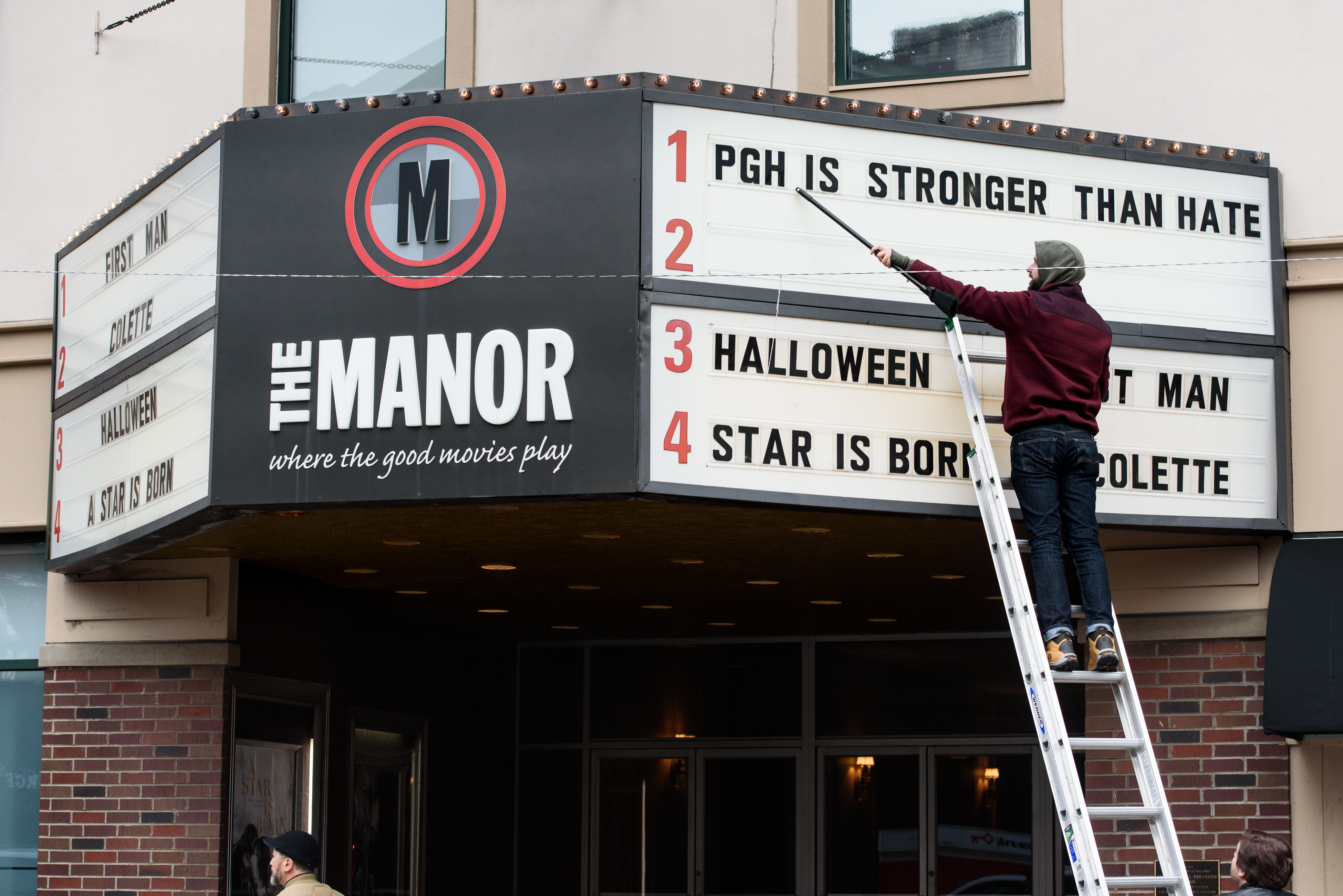 Geoff Sanderson of Regent Square writes “PGH is stronger than hate” on the theater marquee at The Manor Theater, Monday, Oct. 29, 2018, in Squirrel Hill. “It is cool that more and more businesses around the community are starting to come together and do these kind of things,” said Sanderson, who got the request to change the marquee from the theater owner, who is from Squirrel Hill. (Stephanie Strasburg/Post-Gazette)