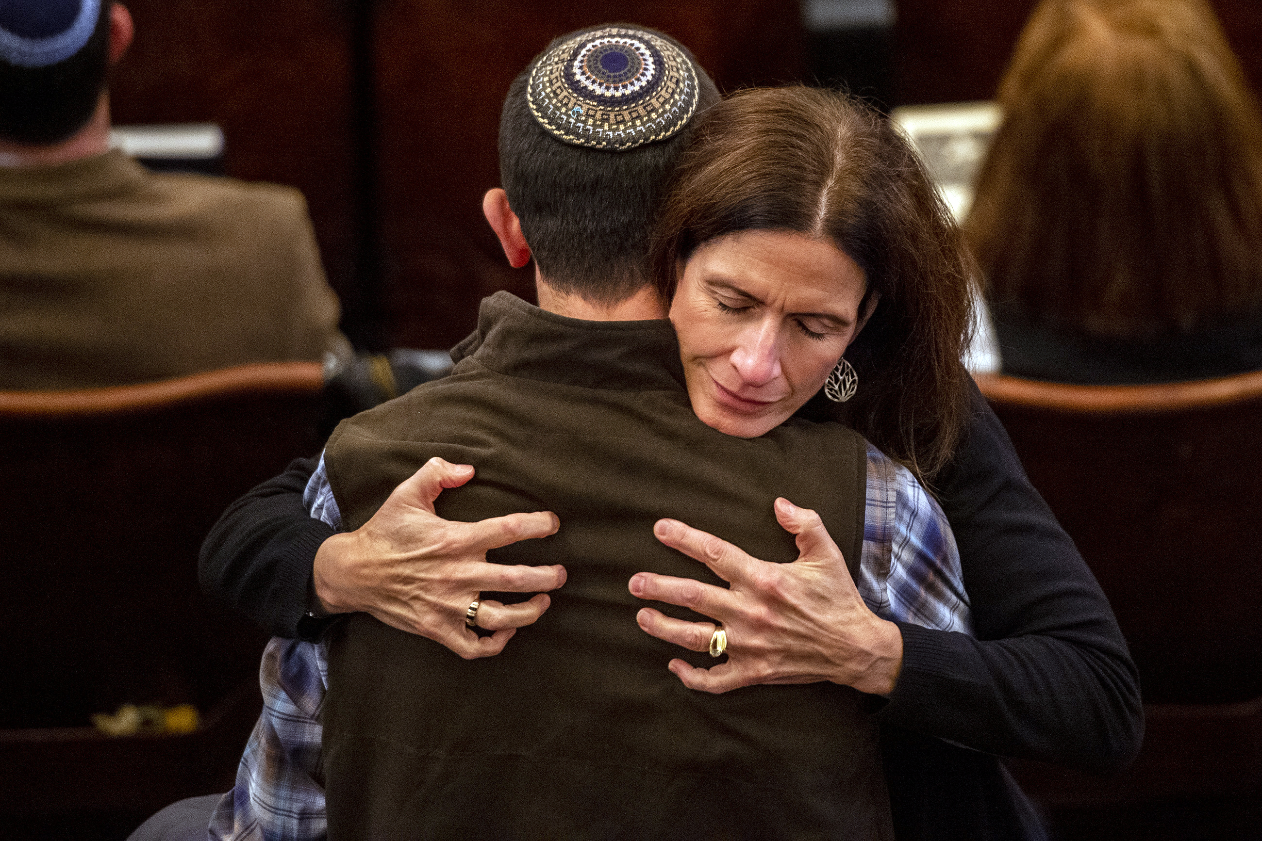 Worshipers embrace before the start of the Shabbat service, Friday, Nov. 2, 2018, at Congregation Rodef Shalom Congregation in Shadyside. The Shabbat service, the first since the shooting at the Tree of Life synagogue, was open to people of all faiths. (Michael M. Santiago/Post-Gazette)