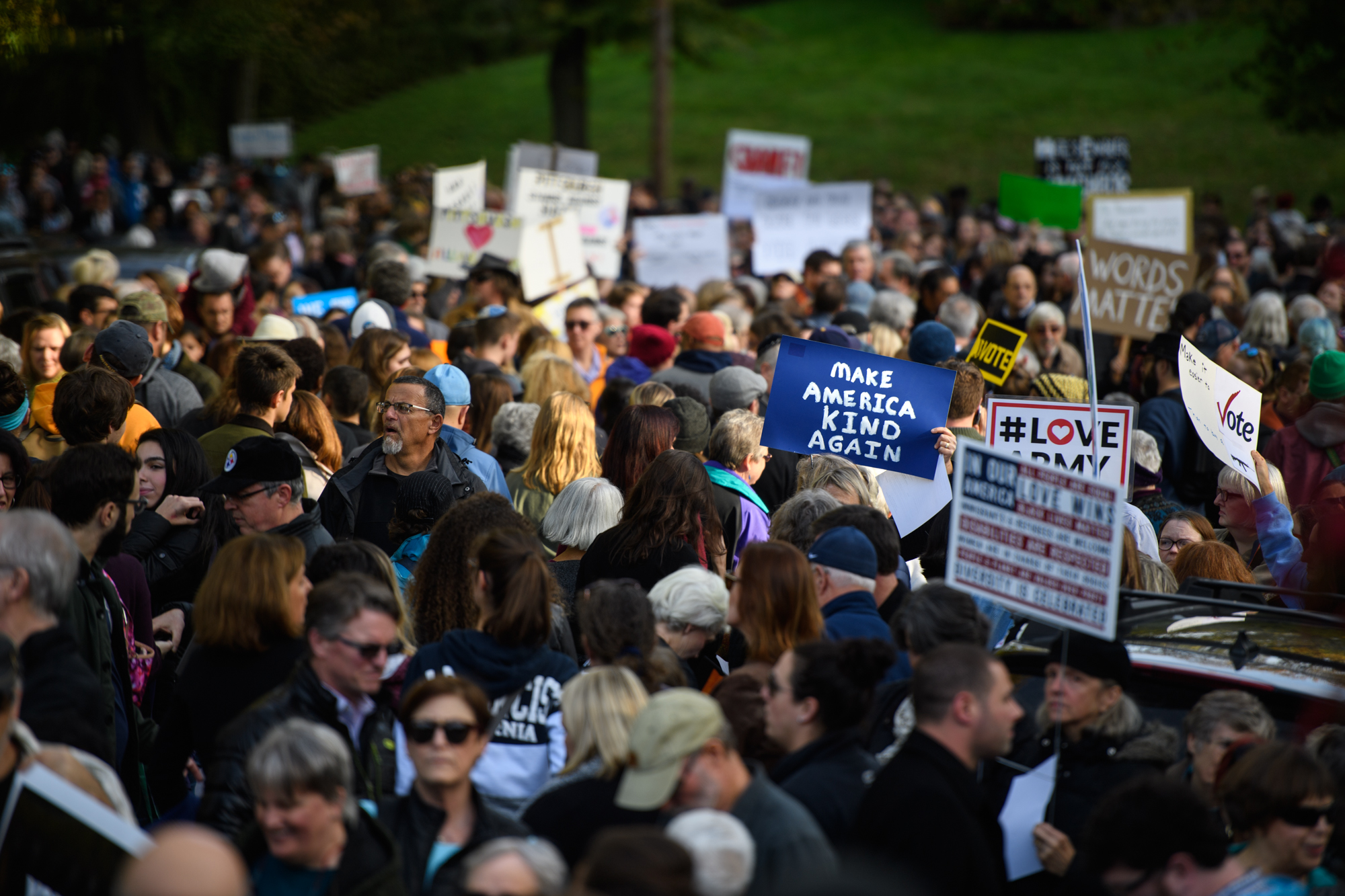 Thousands of people are lining up along Beechwood Blvd. and Forbes Ave. to stand together in solidarity with the Pittsburgh Jewish community as President Donald J. Trump arrives in the city to pay his respects to those lost and injured at Saturday’s of Tree of Life synagogue shootings on Tuesday, Oct. 30, 2018, in Squirrel Hill. (Stephanie Strasburg/Post-Gazette)