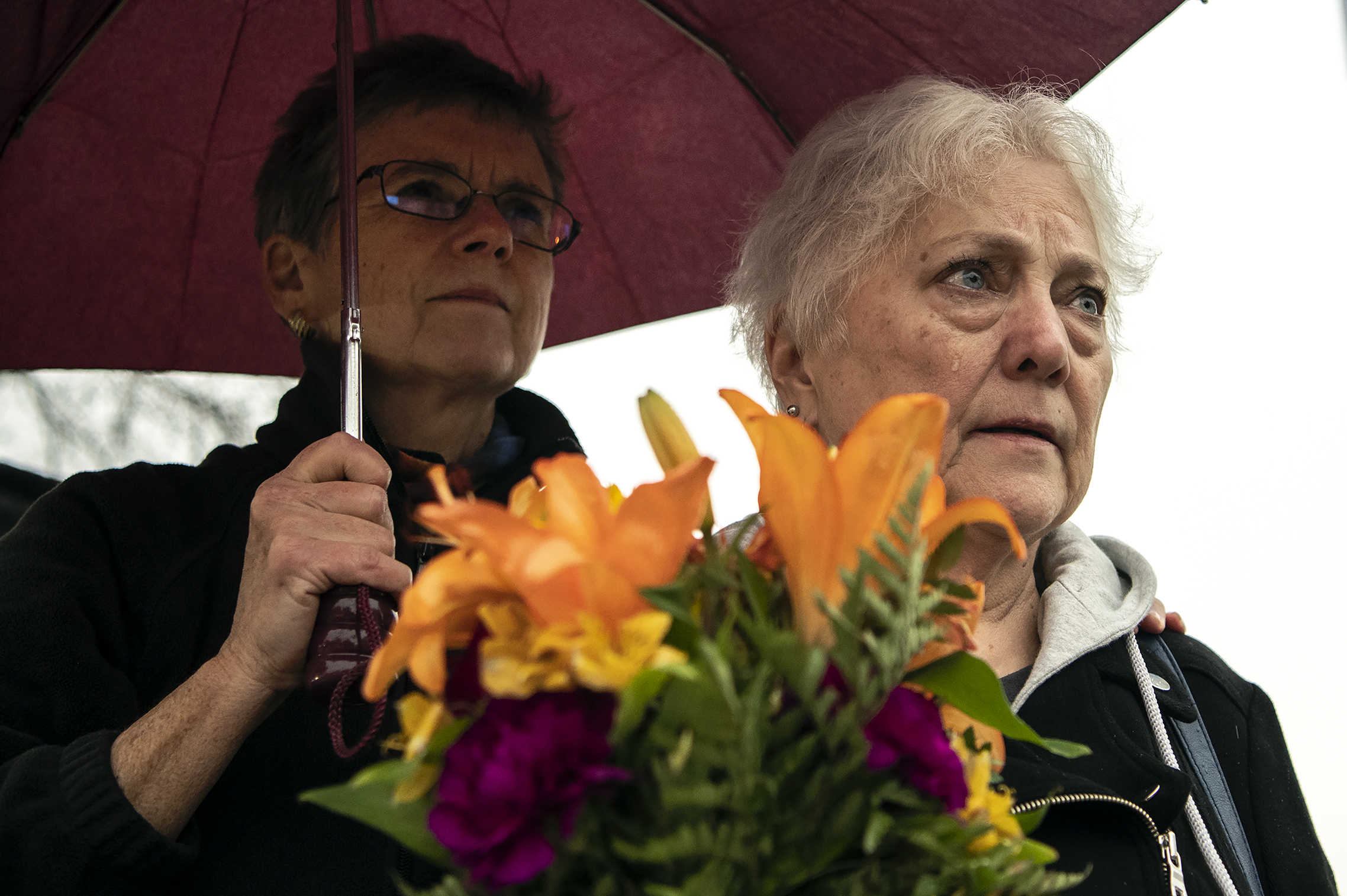 Veronica Pratt, left, holds an umbrella for Linda Shab, both of Regent Square, as Shab cries while waiting to cross the street to add flowers to a memorial, Sunday, Oct. 28, 2018, in front of the Tree of Life Congregation in Squirrel Hill. (Alexandra Wimley/Post-Gazette)