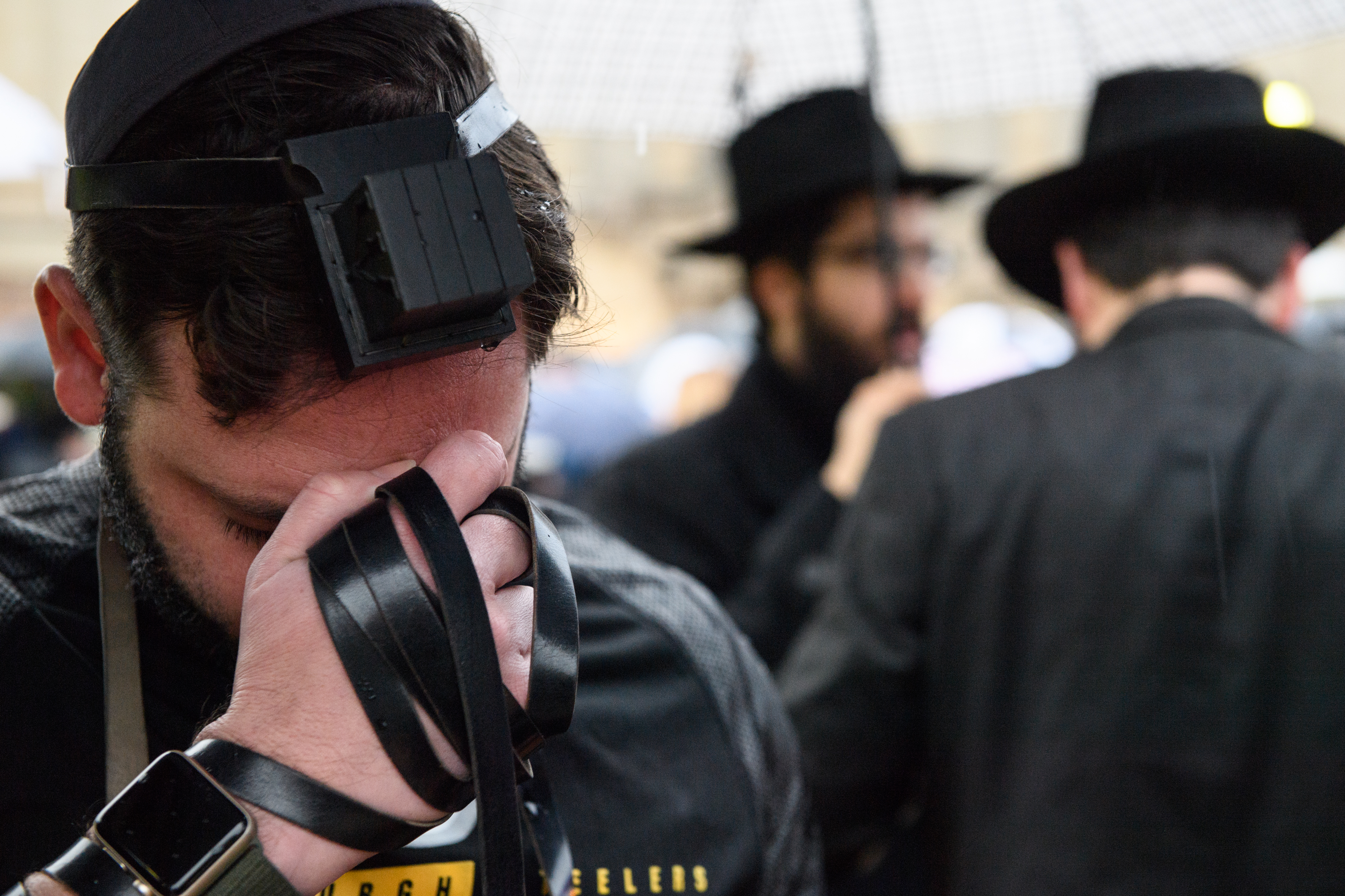 Seth Oranburg of Squirrel Hill puts on tefillin, boxes containing fragments of Hebrew parchment, as he attends an interfaith community vigil to honor those impacted by the previous day’s shooting, Sunday, Oct. 28, 2018, at Soldiers and Sailors Memorial Hall and Museum in Oakland. (Stephanie Strasburg/Post-Gazette)