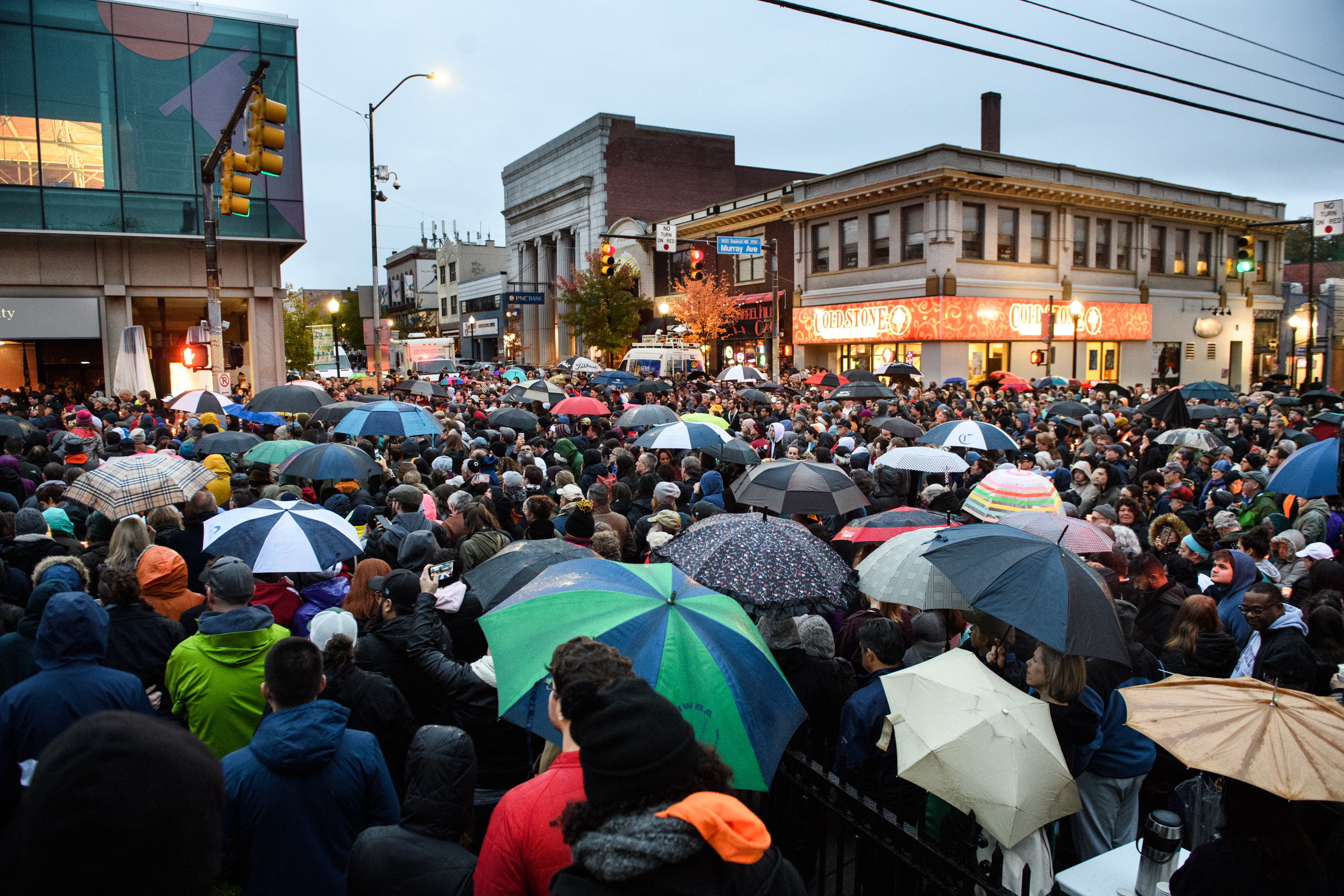 Tree of Life shooting October 28, 2018 • 3000 × 2000 • A portrait of the ‘darkest day in Pittsburgh’s history’ People gather for a vigil on Murray and Forbes Avenues, blocks from where an active shooter shot multiple people at Tree of Life Congregation synagogue on Saturday, Oct. 27, 2018, in Squirrel Hill. (Stephanie Strasburg/Post-Gazette)