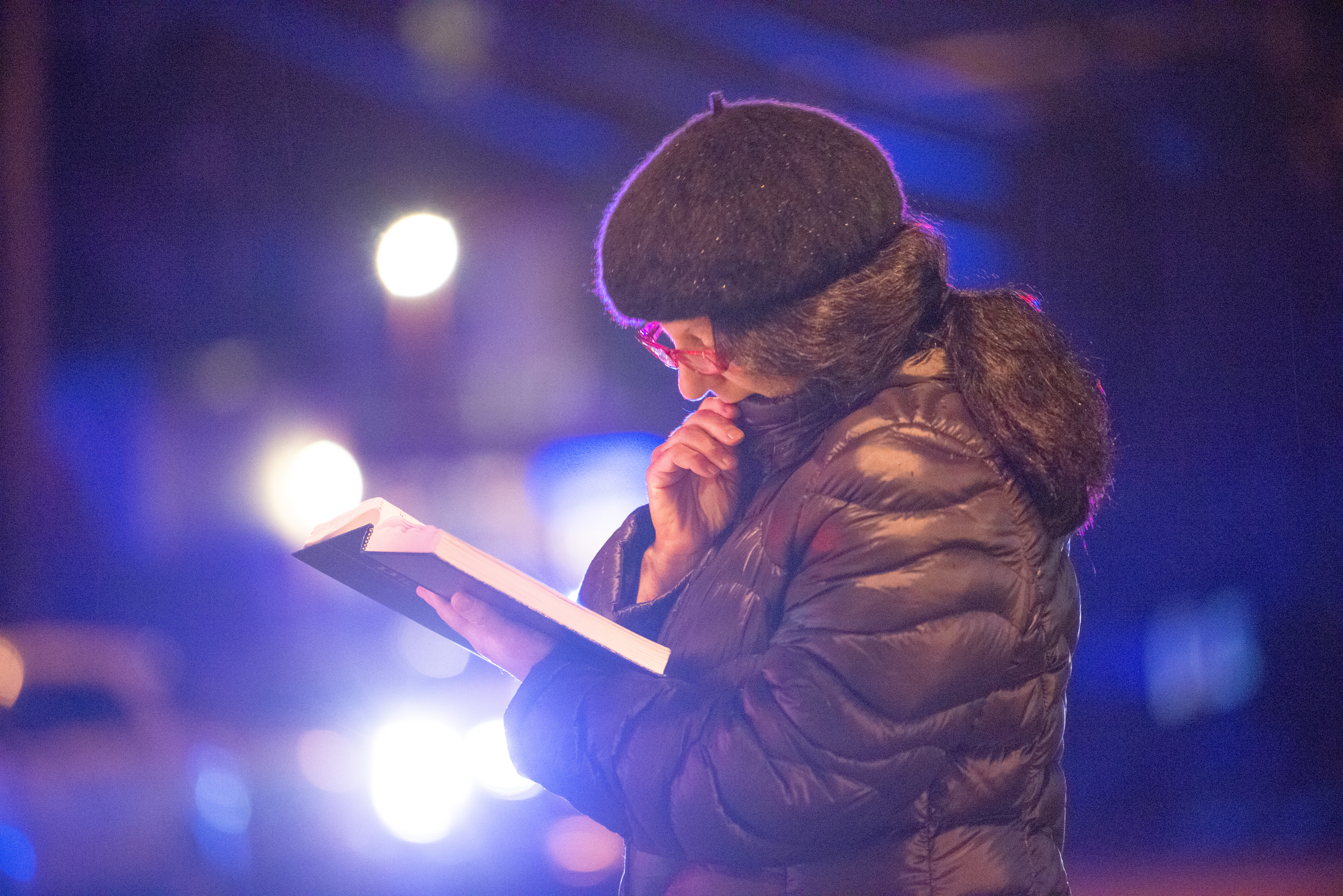 Nancy Clark of Squirrel Hill reads from the Tehillim as police lights flash and rain soaks the pages as she stands near away from Tree of Life Congregation, on Saturday, Oct. 27, 2018, in Squirrel Hill. Eleven people were killed there, along with multiple injuries during a mass shooting. (Andrew Stein/Post-Gazette)