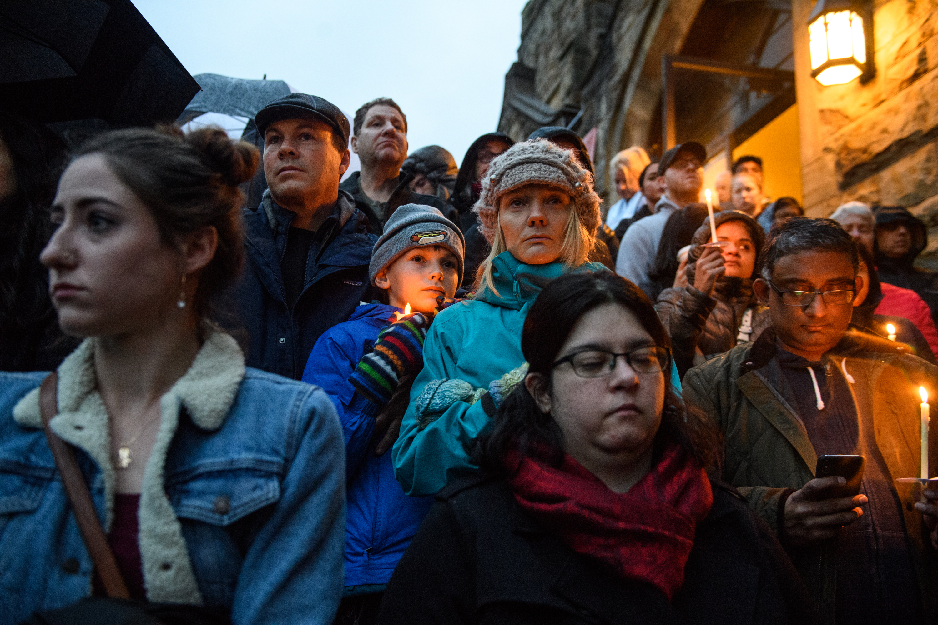People stand on the stairs of Sixth Presbyterian Church as the crowd spills up the hill and down the street for a vigil blocks from where an active shooter shot multiple people at Tree of Life Congregation synagogue on Saturday, Oct. 27, 2018, in Squirrel Hill. (Stephanie Strasburg/Post-Gazette)