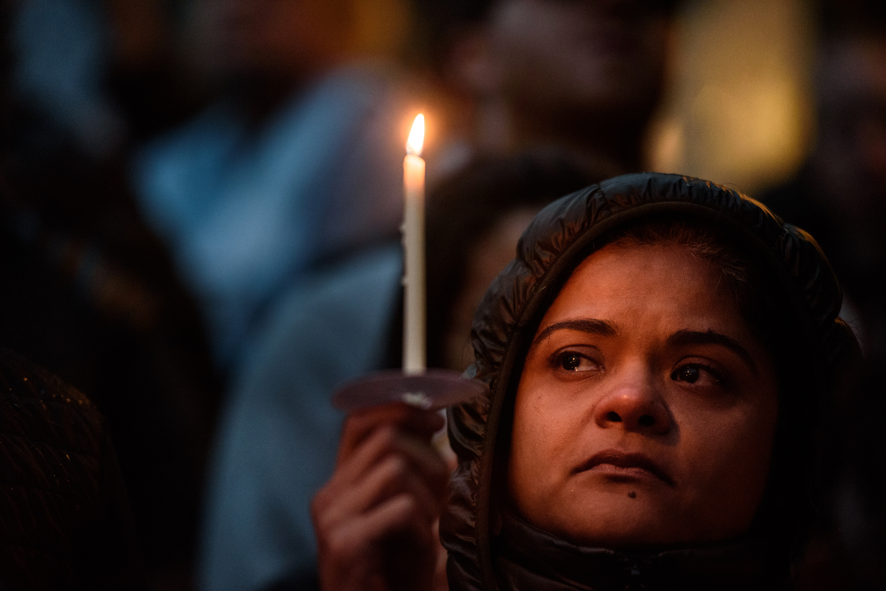 Tears well in the eyes of Tejal Bhojak, 45, of Squirrel Hill, as she holds a candle during a vigil blocks from where an active shooter shot multiple people at Tree of Life Congregation synagogue on Saturday, Oct. 27, 2018, in Squirrel Hill. “Our entire life is lived here, we’re just coming out in support,” said Bhojak, who had been following the news all day. (Stephanie Strasburg/Post-Gazette)