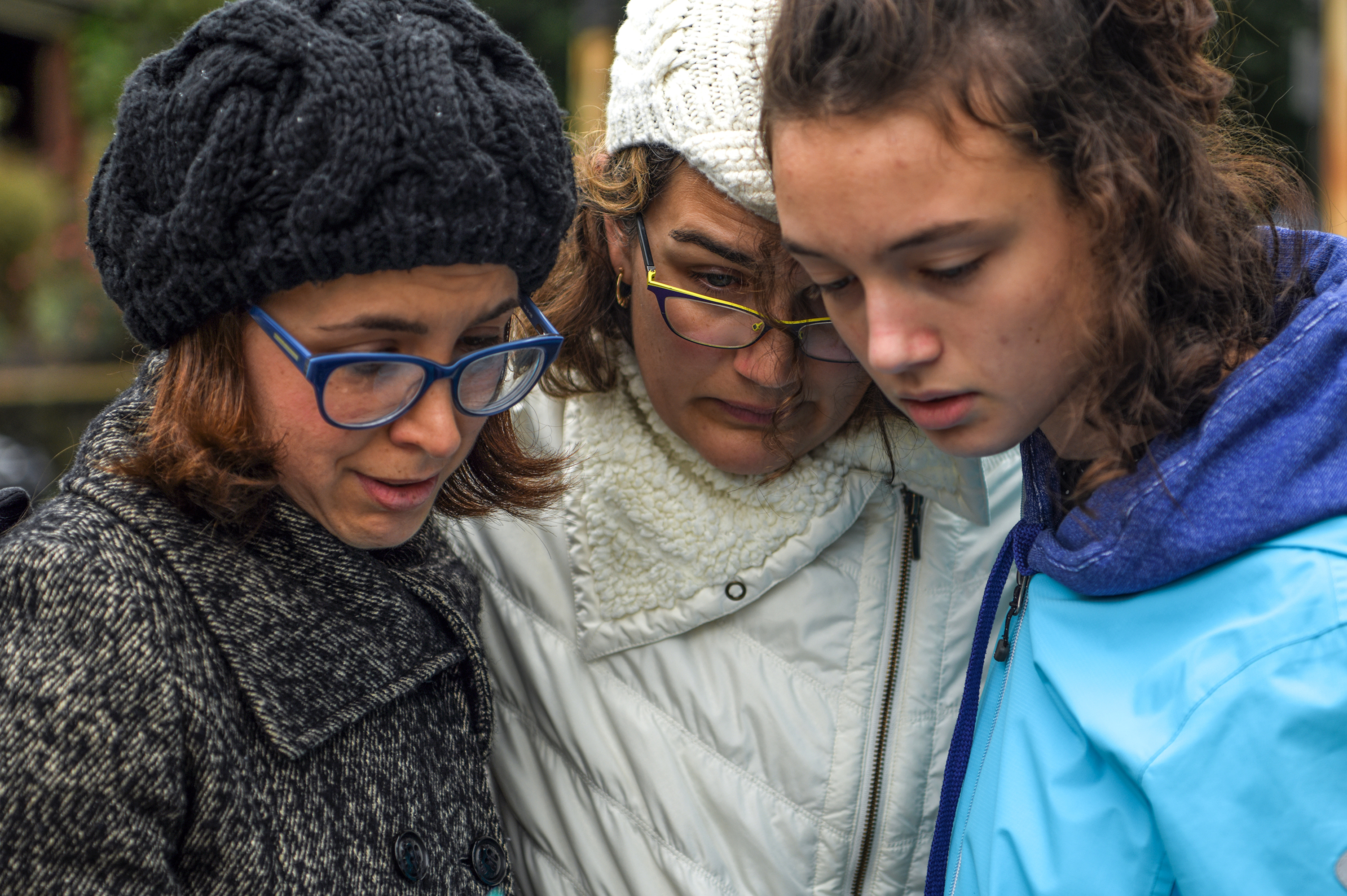 From left, Tammy Hepps, Kate Rothstein, and her daughter Simone Rothstein, all of Squirrel Hill, read from a religious text and embrace after multiple people were shot at the nearby Tree of Life Congregation, Saturday, Oct. 27, 2018, at the intersection of Shady Avenue and Northumberland Street in Squirrel Hill. (Alexandra Wimley/Post-Gazette)