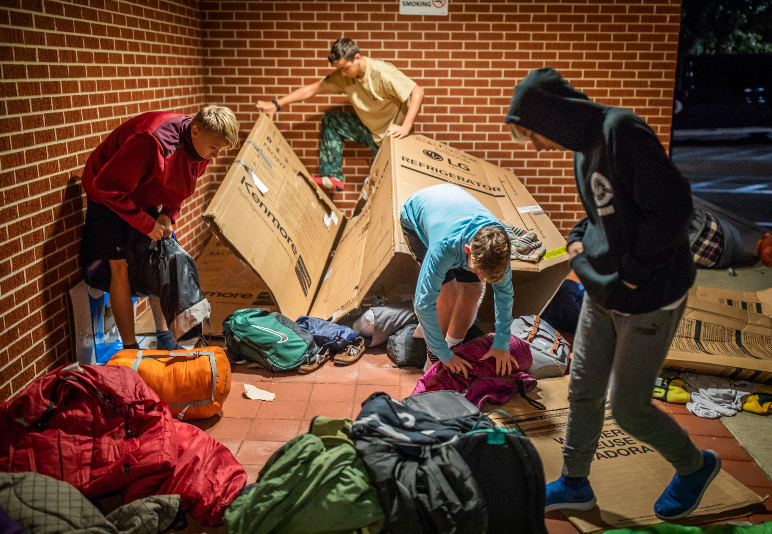Students at Our Lady of the Sacred Heart High School clean their camp site after sleeping outside at the school during the Box Out event, Friday, Oct. 5, 2018, in Moon. Students slept in boxes and sleeping bags outside the school’s gym during the overnight event. In it’s sixth year, the event is meant to raise awareness to homelessness. It helps you be grateful that you dont have to do this every night like some people do, said OLSH senior Sophia Blake. The students have to raise sponsorships for each hour of the event and have raised more than $2000 so far this year. (Andrew Rush/Post-Gazette)