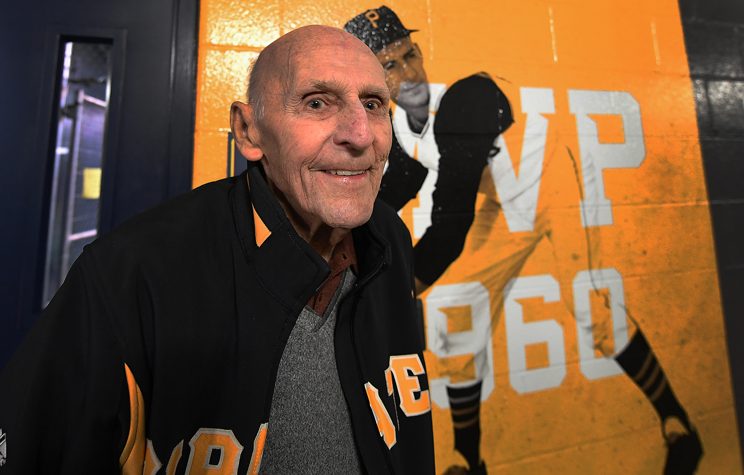 20190401pdPirates10 April 1, 2019 • 2600 × 1660 • Opening Day at PNC Park in visuals Dick Groat poses in front of a photo of him from the 1960 Pirates team on the wall near the clubhouse Monday, April 1, 2019, at PNC Park. (Peter Diana/Post-Gazette)