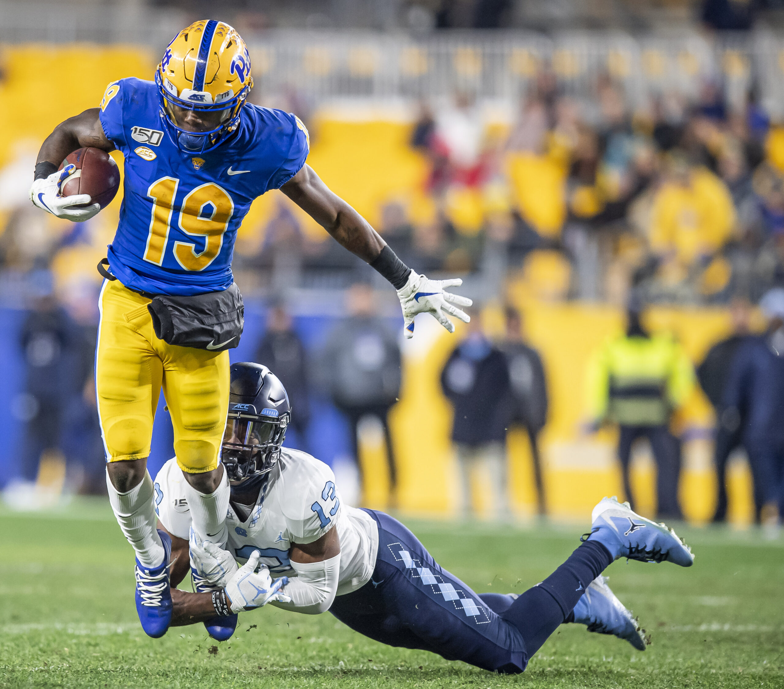 Pitt wide receiver V’Lique Carter rushes pas North Carolina defensive back Don Chapman on Thursday, Nov. 14, 2019, at Heinz Field. (Steph Chambers/Post-Gazette)