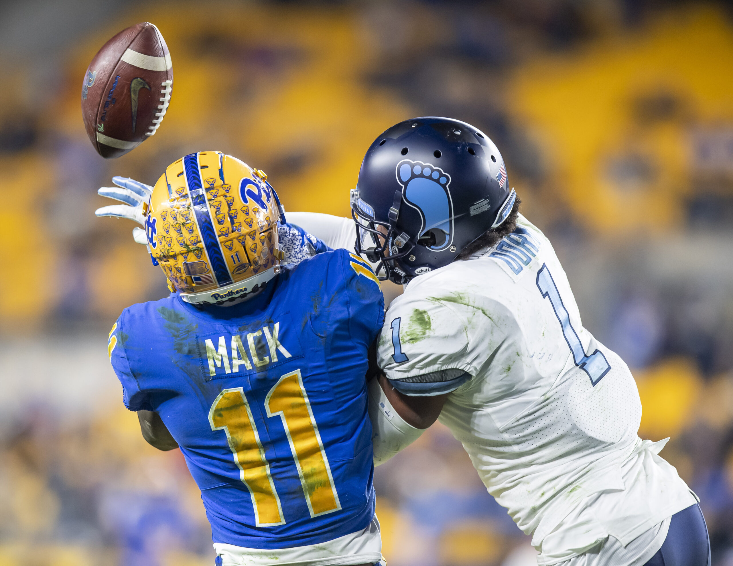 Pitt wide receiver Taysir Mack has his pass blocked by North Carolina defensive back Myles Dorn on Thursday, Nov. 14, 2019, at Heinz Field. (Steph Chambers/Post-Gazette)