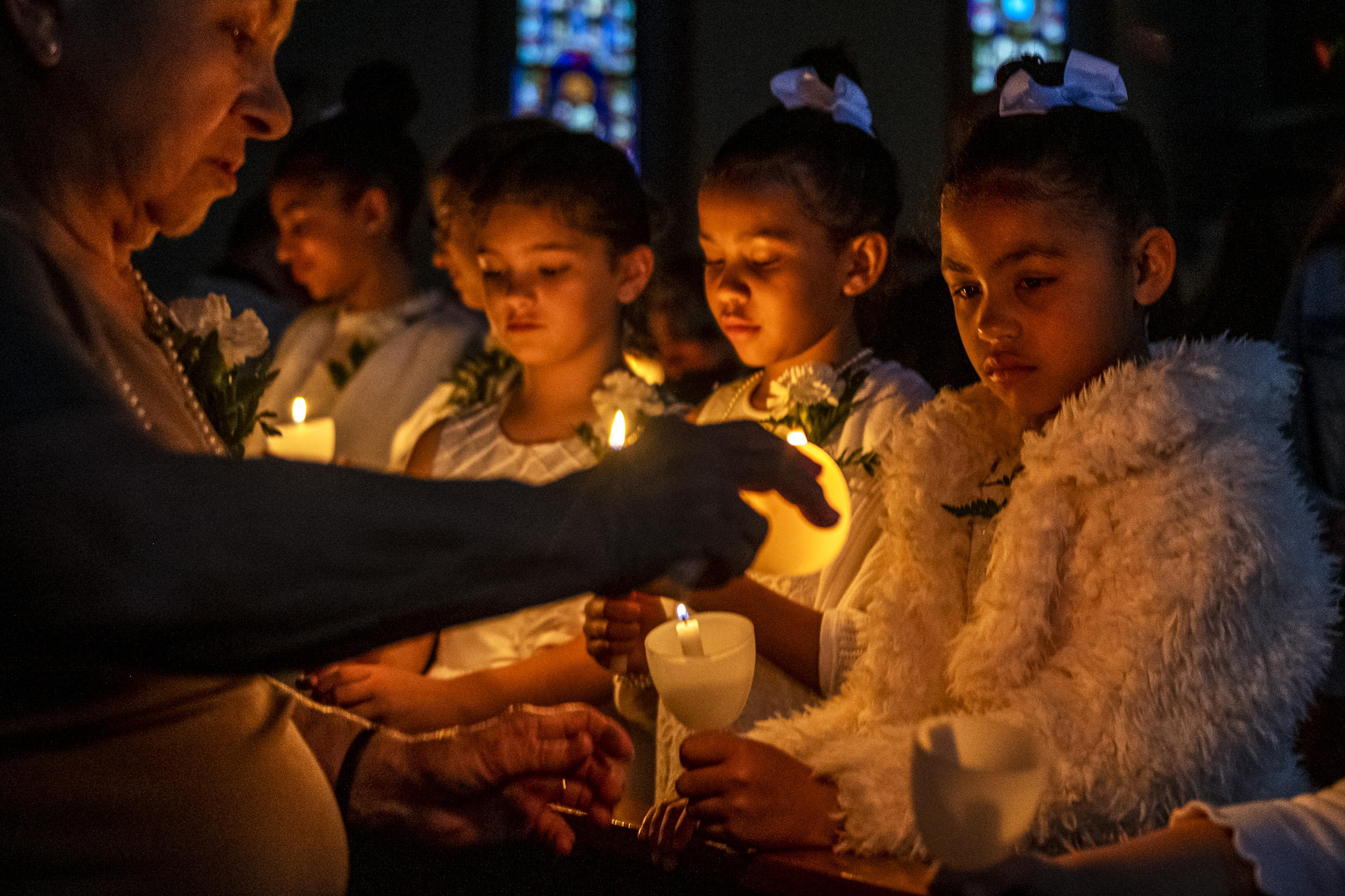 Andrea Urban, of Homestead, left, lights the candle of Halle Fincik, of Homestead, right, during a mass commemorating Easter, Saturday, April 27, 2019, at St Nicholas Orthodox CR Church in Homestead. Orthodox Christians around the world commemorate Easter Sunday April 28. The Orthodox use a different method for calculating the date of Easter than Western Christians which can often land on different dates. (Michael M. Santiago/Post-Gazette)